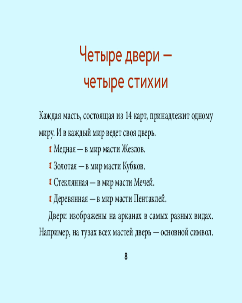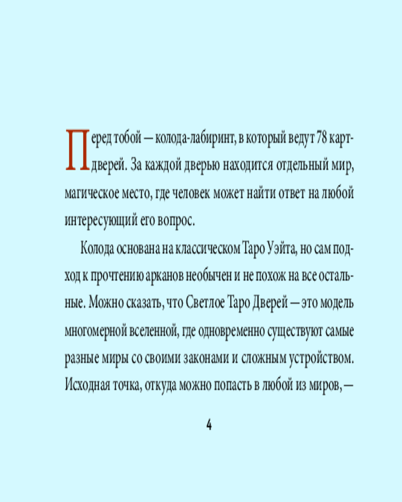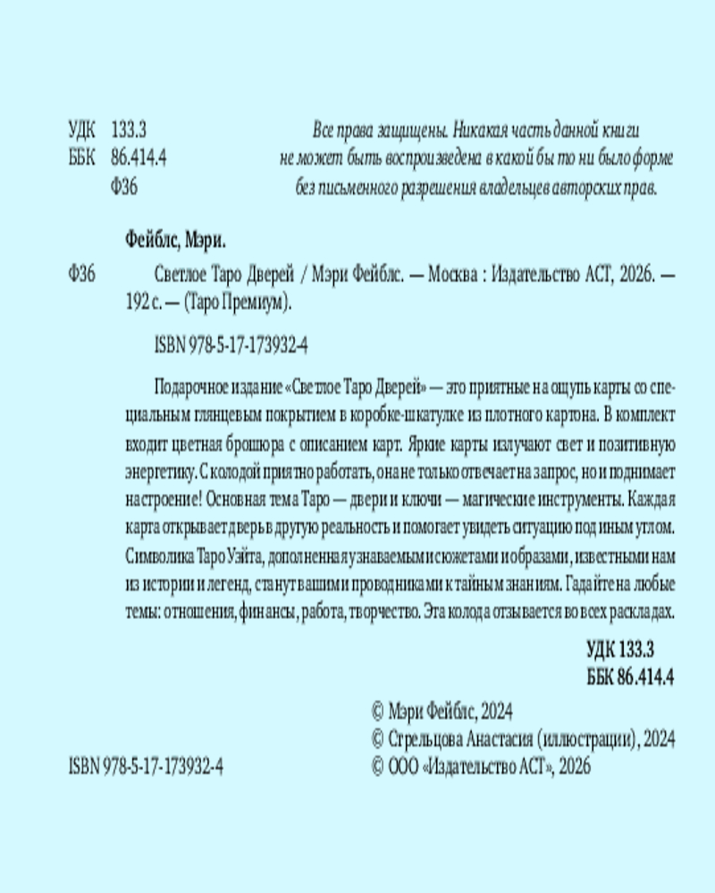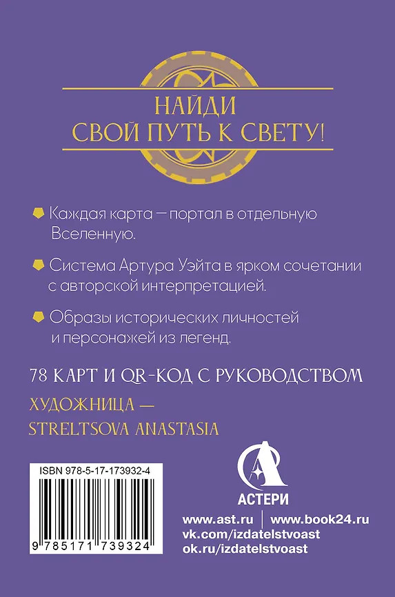 💳 Оплатить за товар можно при получении 🇰🇿 Есть бесплатная доставка по Казахстану от 1 дня 🎁 Копите бонусы с каждой покупки Серия: Таро премиум Откройте дверь в новые реальности с подарочным изданием Светлого Таро Дверей! Приятные на ощупь карты в коробочке из плотного картона. В комплект входит цветная брошюра с описанием карт. Здесь переплетаются миры Воды, Земли, Огня и Воздуха, а путь указывают известные мифологические и исторические фигуры: Локи, Меркурий, Цинь Шихуанди, Осирис. Каждая карта — это дверь в место, где вы найдете ответ на интересующие вопросы. Возможно, ответ находится в великолепном Древнем Риме, а может, вы отыщете его в Избушке на Курьих Ножках. |