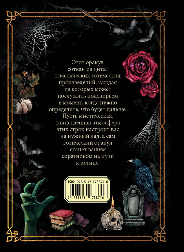 💳 Оплатить за товар можно при получении 🇰🇿 Есть бесплатная доставка по Казахстану от 1 дня 🎁 Копите бонусы с каждой покупки Серия: Книга гаданий Этот оракул соткан из цитат классических готических произведений, каждая из которых может послужить подспорьем в момент, когда нужно определить, что будет дальше. Пусть мистическая, таинственная атмосфера этих строк настроит вас на нужный лад, а сам готический оракул станет вашим соратником на пути к истине. |