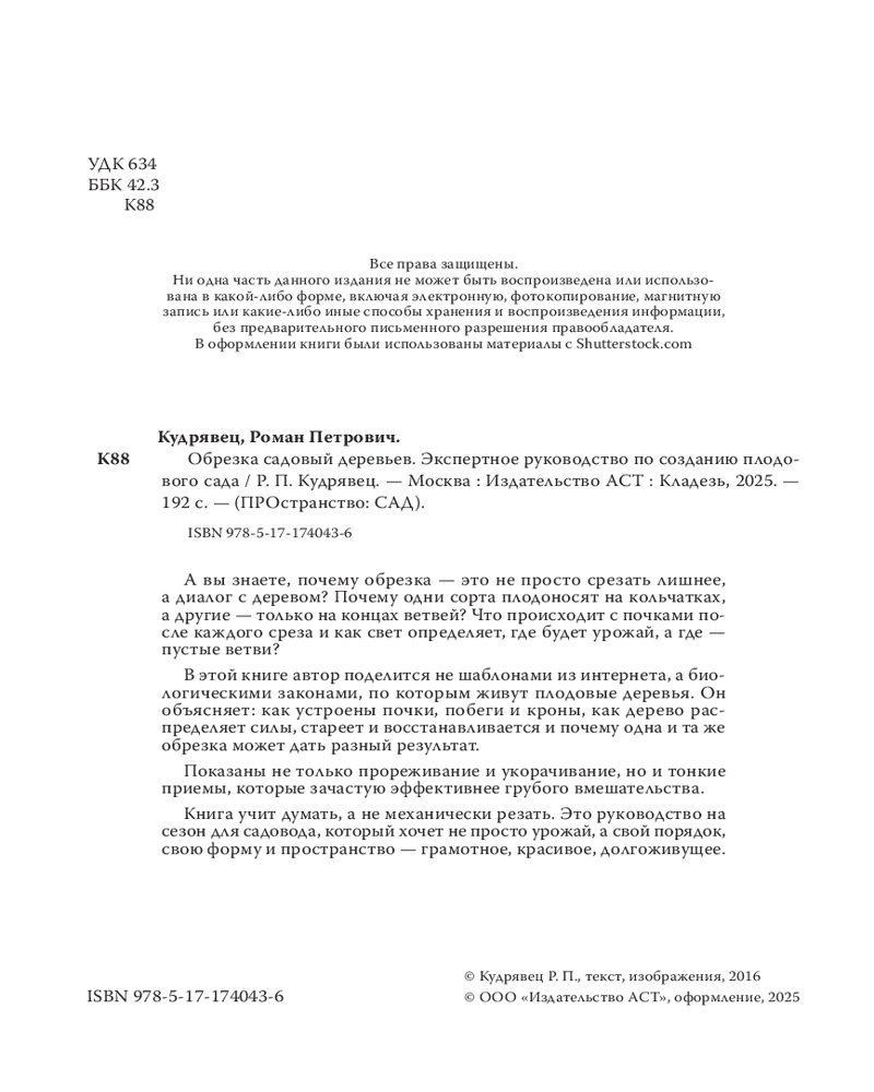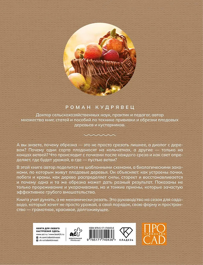 💳 Оплатить за товар можно при получении 🇰🇿 Есть бесплатная доставка по Казахстану от 1 дня 🎁 Копите бонусы с каждой покупки Серия: ПРОстранство: САД А вы знаете, почему обрезка — это не просто срезать лишнее, а диалог с деревом? Почему одни сорта плодоносят на кольчатках, а другие — только на концах ветвей? Что происходит с почками после каждого среза и как свет определяет, где будет урожай, а где — пустые ветви? В этой книге автор поделится не шаблонами из интернета, а биологическими законами, по которым живут плодовые деревья. Он объясняет: как устроены почки, побеги и кроны, как дерево распределяет силы, стареет и восстанавливается, и почему одна и та же обрезка может дать разный результат. Показаны не только прореживание и укорачивание, но и тонкие приёмы, которые зачастую эффективнее грубого вмешательства. Книга учит думать, а не механически резать. Это руководство на сезон для садовода, который хочет не просто урожай, а свой порядок, свою форму и пространство — грамотное, красивое, долгоживущее. |