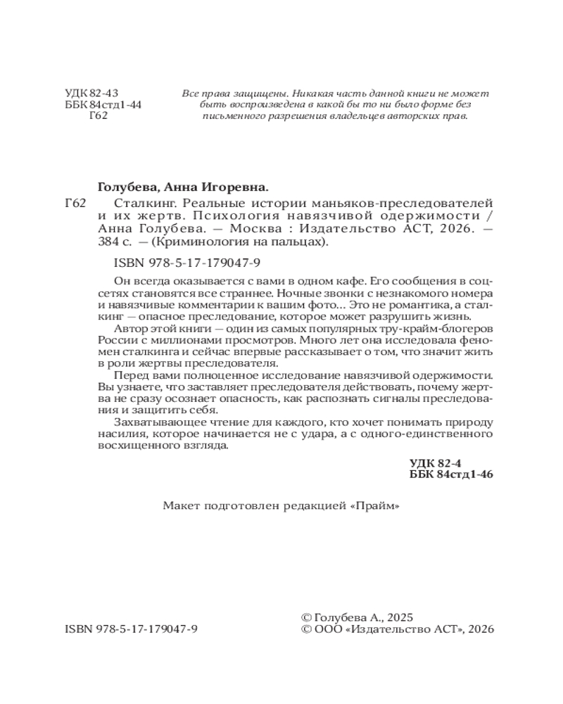 Сталкинг. Реальные истории маньяков-преследователей и их жертв. Психология навязчивой одержимостиВ данный момент этот товар отсутствует в продаже. Возможно, у нас найдется аналогичный или похожий товар здесь. Серия: Криминология на пальцах Он всегда оказывается с вами в одном кафе. Его сообщения в соцсетях становятся всё страннее. Ночные звонки с незнакомого номера и навязчивые комментарии к вашим фото… Это не романтика, а сталкинг — опасное преследование, которое может разрушить жизнь. Автор этой книги — один из самых популярных тру-крайм-блогеров России с миллионами просмотров. Много лет она исследовала феномен сталкинга и сейчас впервые рассказывает о том, что значит жить в роли жертвы преследователя. |