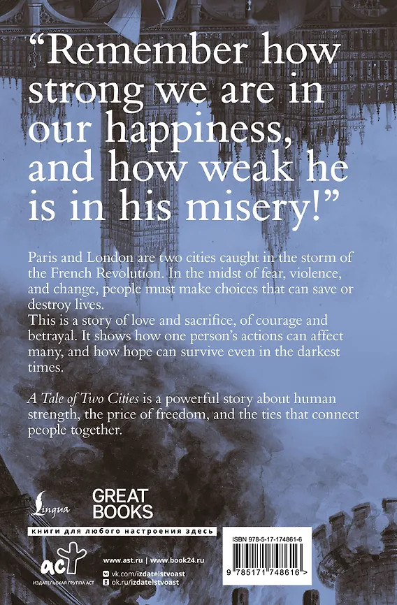 💳 Оплатить за товар можно при получении 🇰🇿 Есть бесплатная доставка по Казахстану от 1 дня 🎁 Копите бонусы с каждой покупки Серия: Great Books «Повесть о двух городах» — один из самых известных романов Чарльза Диккенса, действие которого разворачивается на фоне Великой французской революции. История охватывает судьбы людей, живущих в Лондоне и Париже, в эпоху, когда мир оказался расколот между жестокостью и надеждой, отчаянием и возрождением. |