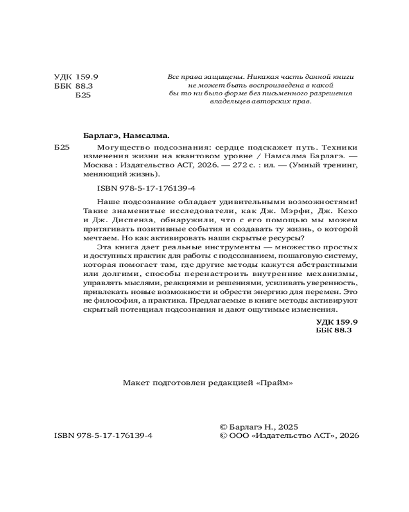 💳 Оплатить за товар можно при получении 🇰🇿 Есть бесплатная доставка по Казахстану от 1 дня 🎁 Копите бонусы с каждой покупки Серия: Умный тренинг, меняющий жизнь Наше подсознание обладает поистине удивительными возможностями! Такие знаменитые исследователи, как Дж. Мэрфи, Дж. Кехо и Дж. Диспенза, обнаружили, что с его помощью мы можем притягивать позитивные события и создавать ту жизнь, о которой мечтаем. Но как активировать наши скрытые ресурсы? |