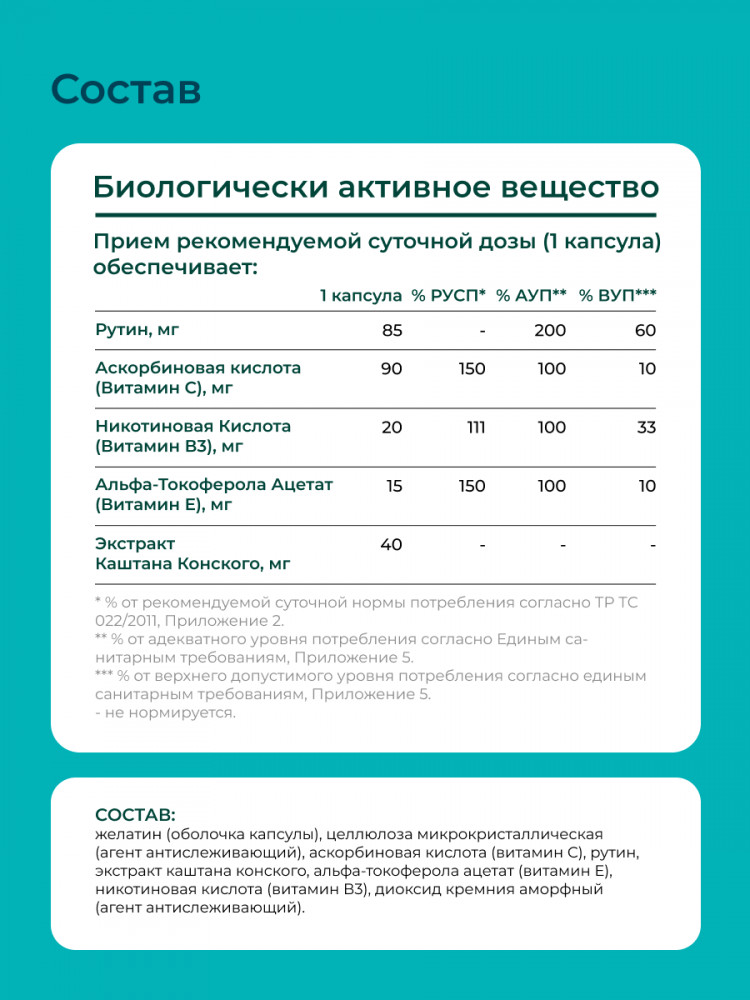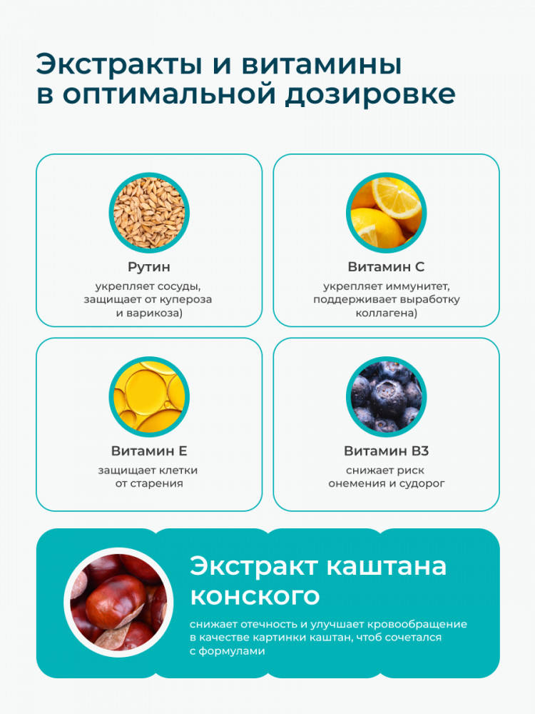 Никотиновая кислота (В3) — расширяет мелкие сосуды, улучшает питание тканей, снижает риск онемения и судорог. Комплекс экстракта каштана и рутина — уменьшает венозный застой, способствует здоровому лимфотоку, помогает от отеков, в том числе как венотоник таблетки от варикоза.