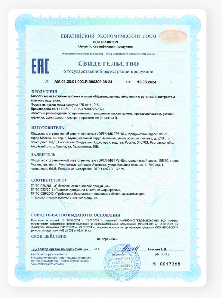 Продукт сертифицирован. Биологически активная добавка, не лекарственное средство.