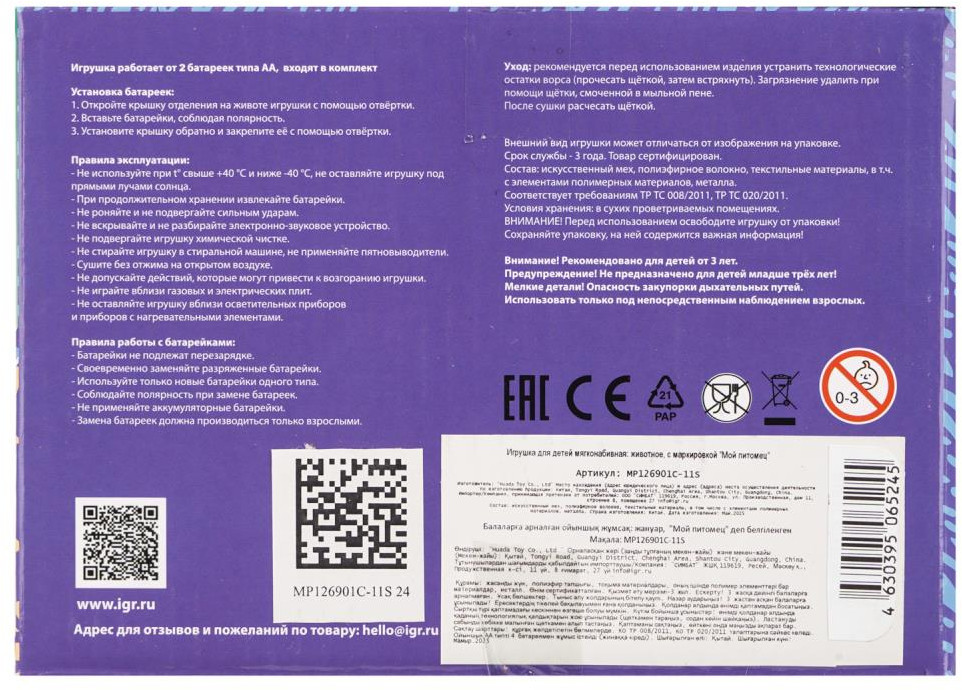 💳 Оплатить за товар можно при получении 🇰🇿 Есть бесплатная доставка по Казахстану от 1 дня 🎁 Копите бонусы с каждой покупки Интерактивная игрушка «Капибара» ТМ «Мой питомец» станет добрым другом для вашего ребёнка. Каждый ребёнок будет безмерно рад обзавестись такой очаровательной капибарой — пусть это всего лишь игрушка, но она удивительно похожа на своего настоящего собрата-грызуна из Южной Америки. Игрушечная капибара умеет забавно пищать и шевелить носиком, а ещё она способна ходить, подпрыгивать и садиться, что делает её по-настоящему живой и увлекательной. Её умилительная мордочка и приятная шёрстка насыщенного коричневого цвета так и манят обнять и погладить — с ней невероятно уютно и тепло. Такая милая игрушка не только подарит малышу море положительных эмоций, но и поможет научиться заботиться о домашнем любимце, развивая в нём чуткость и ответственность. Игра с интерактивной игрушкой ТМ «Мой питомец» развивает: социально-коммуникативные навыки, фантазию, речь, мышление, память и тактильные навыки. |