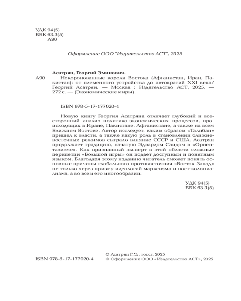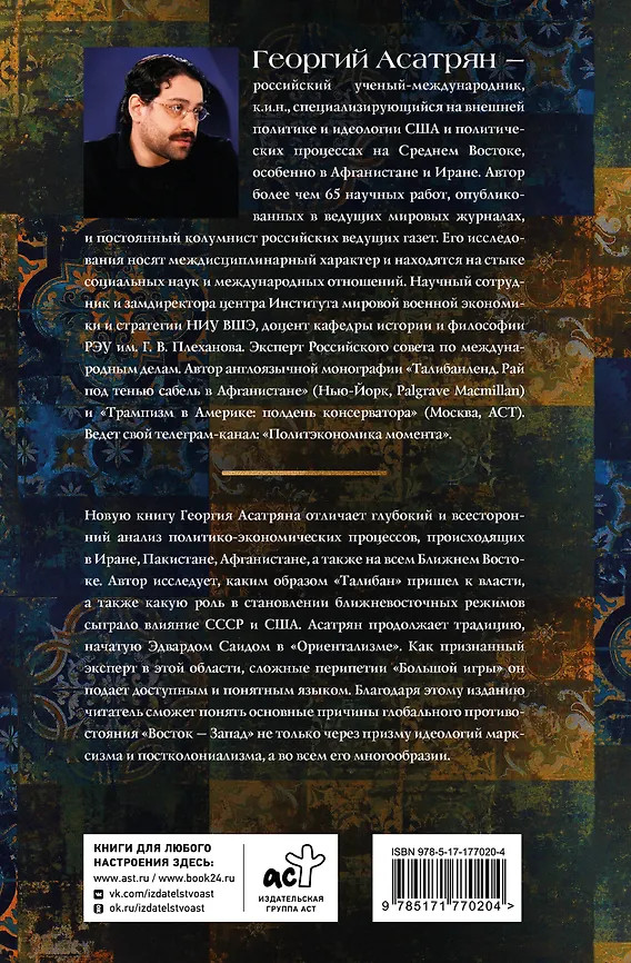💳 Оплатить за товар можно при получении 🇰🇿 Есть бесплатная доставка по Казахстану от 1 дня 🎁 Копите бонусы с каждой покупки Серия: Экономические миры Новую книгу Георгия Асатряна отличает глубокий и всесторонний анализ политико-экономических процессов, происходящих в Иране, Пакистане, Афганистане, а также на всем Ближнем Востоке. Автор исследует, каким образом «Талибан» пришел к власти, а также какую роль в становлении ближневосточных режимов сыграло влияние СССР и США. Асатрян продолжает традицию, начатую Эдвардом Саидом в «Ориентализме». Как признанный эксперт в этой области сложные перипетии «Большой игры» он подает доступным и понятным языком. Благодаря этому изданию читатель сможет понять основные причины глобального противостояния «Восток-Запад» не только через призму идеологий марксизма и пост-колониализма, а во всем его многообразии. |