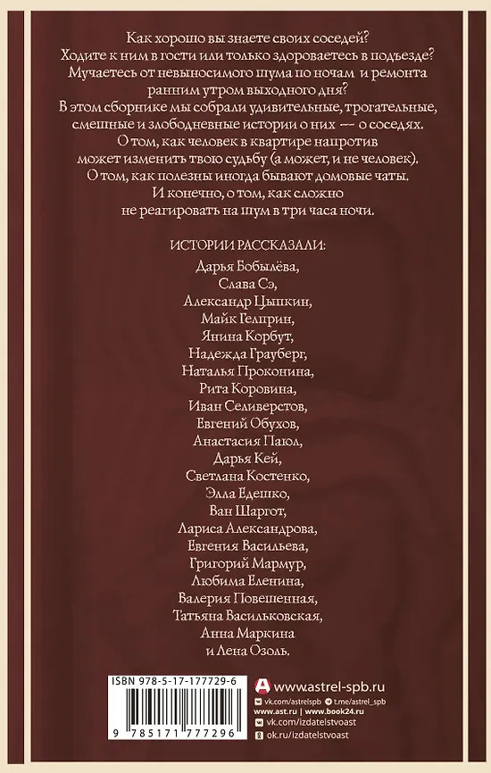 💳 Оплатить за товар можно при получении 🇰🇿 Есть бесплатная доставка по Казахстану от 1 дня 🎁 Копите бонусы с каждой покупки Серия: Удивительные истории Как хорошо вы знаете своих соседей? Ходите к ним в гости или только здороваетесь в подъезде? Мучаетесь от невыносимого шума по ночам и ремонта ранним утром выходного дня? В этом сборнике мы собрали удивительные, трогательные, смешные и злободневные истории о них — о соседях. О том, как человек в квартире напротив может изменить твою судьбу (а может, и не человек). О том, как полезны иногда бывают домовые чаты. И, конечно, о том, как сложно не реагировать на шум в три часа ночи. |