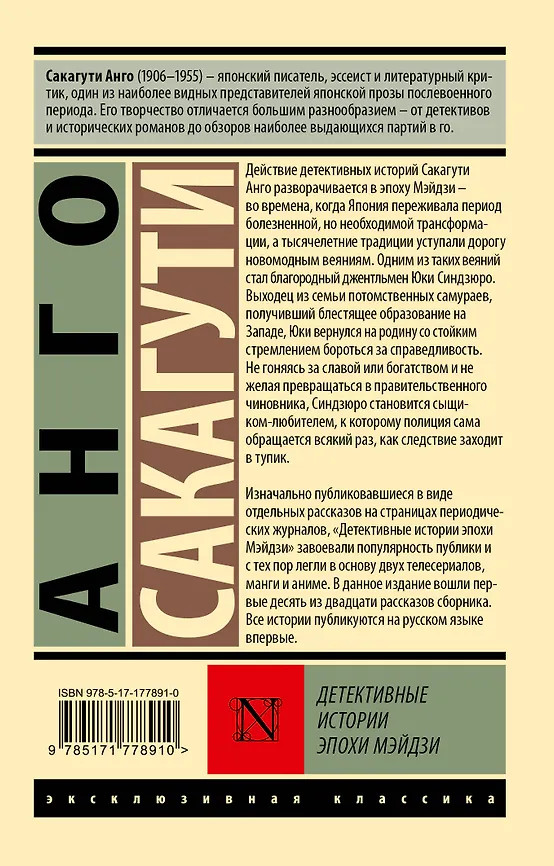 💳 Оплатить за товар можно при получении 🇰🇿 Есть бесплатная доставка по Казахстану от 1 дня 🎁 Копите бонусы с каждой покупки Серия: Эксклюзивная классика Действие детективных историй Сакагути Анго разворачивается в эпоху Мэйдзи — во времена, когда Япония переживала период болезненной, но необходимой трансформации, а тысячелетние традиции уступали дорогу новомодным веяниям. Одним из таких веяний стал благородный джентльмен Юки Синдзюро. Выходец из семьи потомственных самураев, получивший блестящее образование на западе, Юки вернулся на родину со стойким стремлением бороться за справедливость. Не гоняясь за славой или богатством и не желая превращаться в правительственного чиновника, Синдзюро становится сыщиком-любителем, к которому полиция сама обращается всякий раз, как следствие заходит в тупик. |