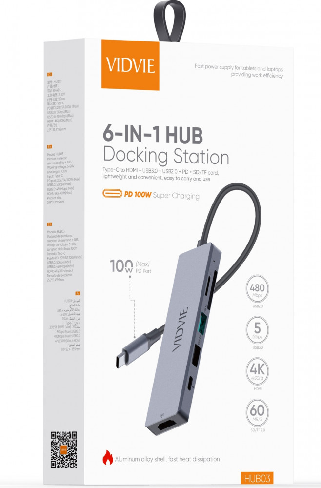 Vidvie Док-станция HUB03В данный момент этот товар отсутствует в продаже. Возможно, у нас найдется аналогичный или похожий товар здесь. Док-станция Vidvie HUB03 — это компактный 6-в-1 USB-C хаб в корпусе из алюминиевого сплава и ABS-пластика. Он оснащен портами USB 3.0, USB 2.0, Type-C (с поддержкой 100 Вт PD), HDMI (4K@30Гц) и слотами SD/TF. Устройство обеспечивает быструю передачу данных и зарядку, совместимо с Windows, Apple OS и Linux. |