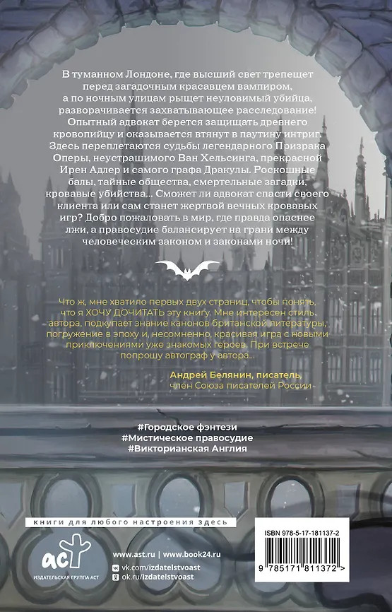 💳 Оплатить за товар можно при получении 🇰🇿 Есть бесплатная доставка по Казахстану от 1 дня 🎁 Копите бонусы с каждой покупки Серия: Nova Fiction. Русская городская фэнтези В туманном Лондоне, где высший свет трепещет перед загадочным красавцем-вампиром, а по ночным улицам рыщет неуловимый убийца, разворачивается захватывающее расследование! Опытный адвокат берется защищать древнего кровопийцу, обвиняемого в серии преступлений, и оказывается втянут в паутину интриг. Здесь переплетаются судьбы легендарного Призрака Оперы, неустрашимого Ван Хельсинга, прекрасной Ирен Адлер и самого графа Дракулы. Роскошные балы, тайные общества, смертельные загадки, кровавые убийства. Сможет ли адвокат доказать невиновность своего клиента или сам станет жертвой кровавых игр бессмертных? Добро пожаловать в мир, где правда опаснее лжи, а правосудие балансирует на грани между человеческим законом и законами ночи! |