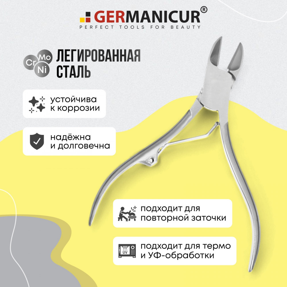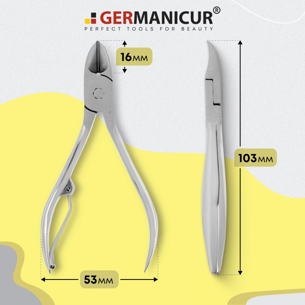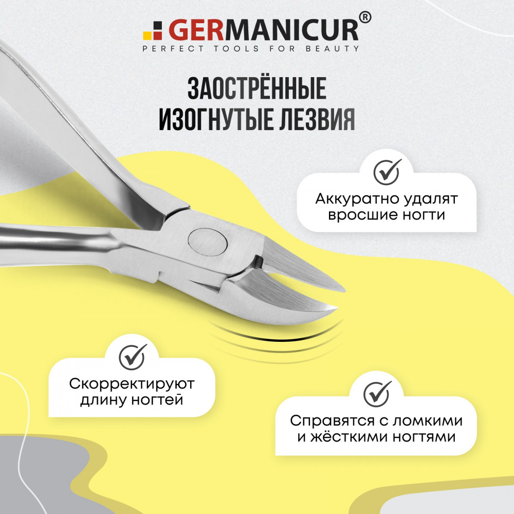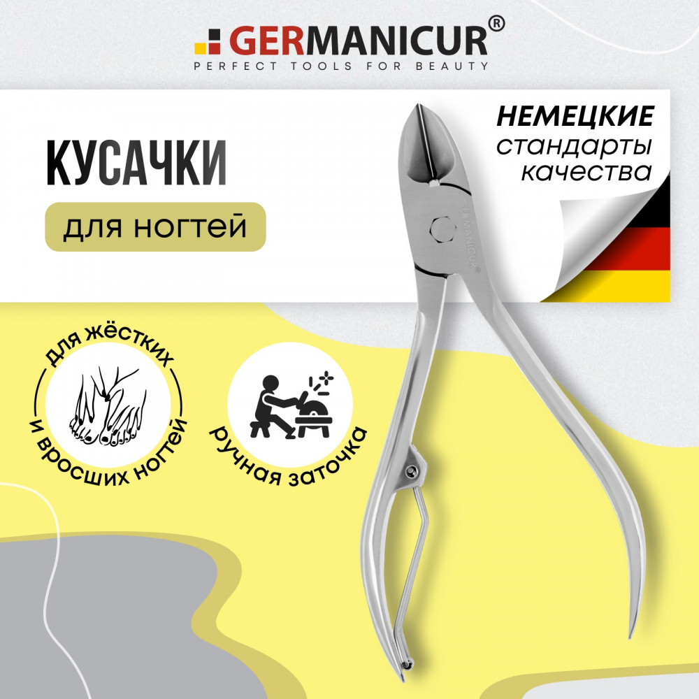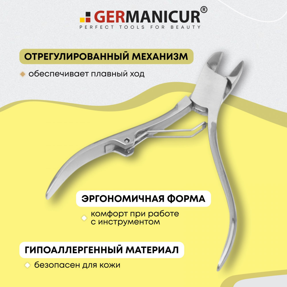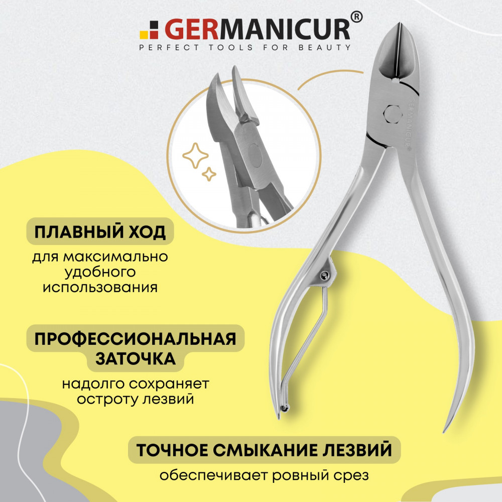 Кусачки Германикюр имеют усиленный механизм который легко справляется в работе с толстыми и грубыми ногтями, а также подходят для ломких и тонких ногтей. Мощные, острые режущие кромки делают ровный срез, препятствуя расслоению ногтей. Слегка загнутые кончики отлично подходят для обработки вросших ногтей.