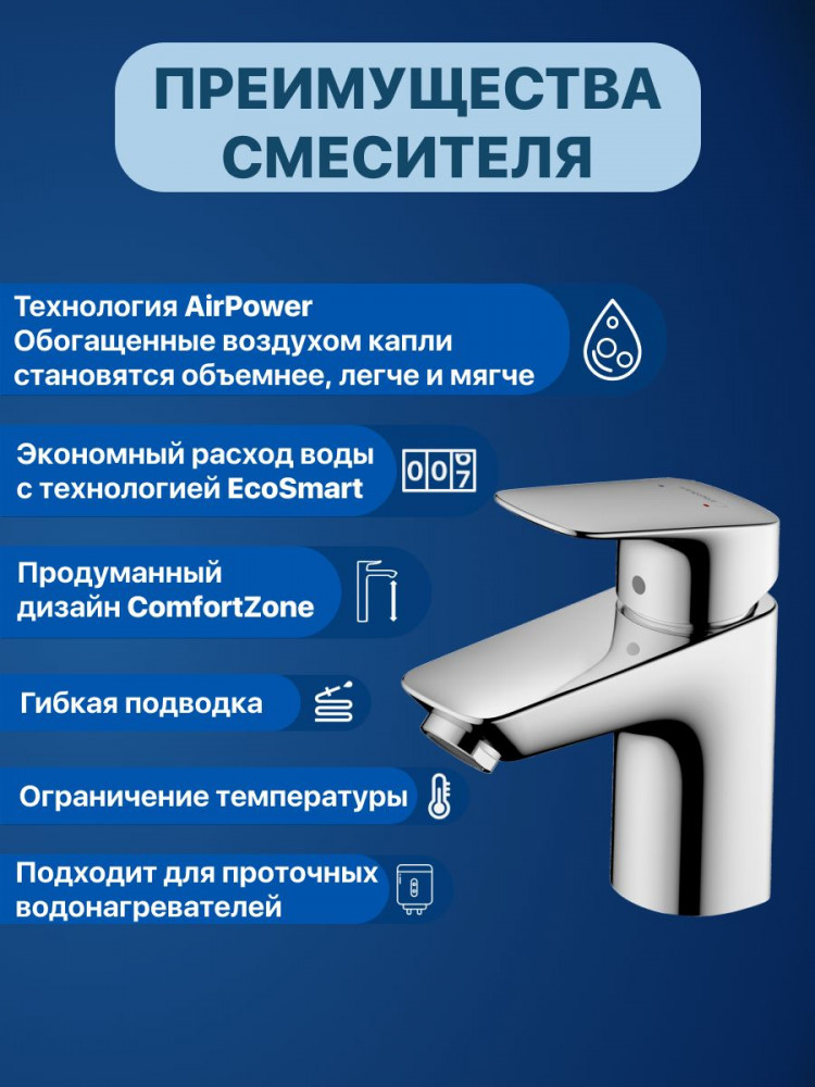 Смеситель для раковины в ванную оснащен технологией EcoSmart, ограничивающей расход воды до 5 л/мин без потери мощности потока. Аэратор насыщает струю воздухом, создавая мягкий напор без брызг, а совместимость с проточными водонагревателями повышает универсальность. Гибкая подводка 3/8» и крепление на гайке ускоряют монтаж на одно отверстие диаметром 34 мм, делая установку быстрой и стабильной.