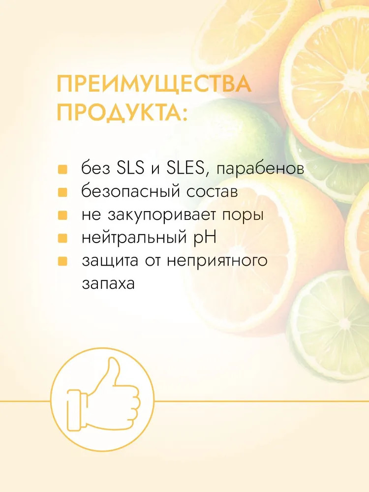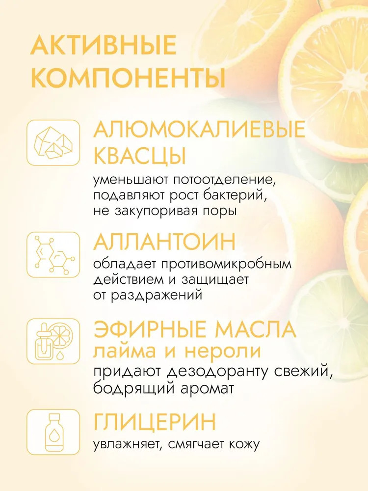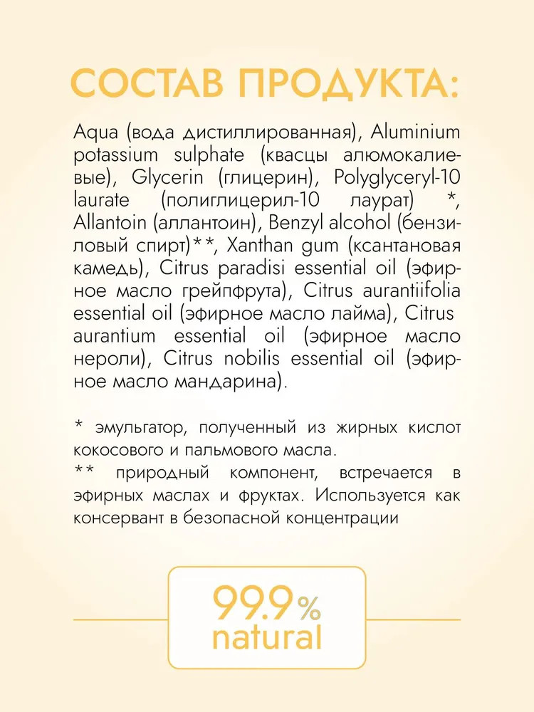 Aqua (вода дистиллированная), Aluminium potassium sulphate (квасцы алюмокалиевые), Glycerin (глицерин), Polyglyceryl-10 laurate (полиглицерил-10 лаурат) *, Allantoin (аллантоин), Benzyl alcohol (бензиловый спирт)**, Xanthan gum (ксантановая камедь), Citrus paradisi essential oil (эфирное масло грейпфрута), Citrus aurantiifolia essential oil (эфирное масло лайма), Citrus aurantium essential oil (эфирное масло нероли), Citrus nobilis essential oil (эфирное масло мандарина). * эмульгатор, полученный из жирных кислот кокосового и пальмового масла. ** природный компонент, встречается в эфирных маслах и фруктах. Используется как консервант в безопасной концентрации.