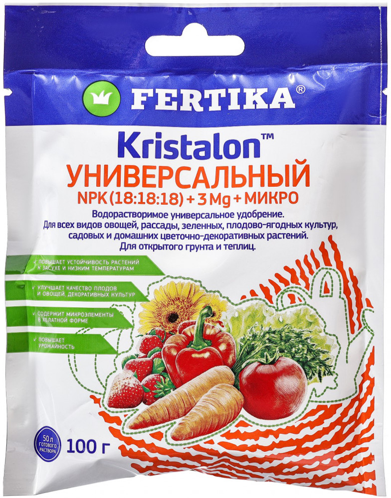 💳 Оплатить за товар можно при получении 🇰🇿 Есть бесплатная доставка по Казахстану от 1 дня 🎁 Копите бонусы с каждой покупки Удобрение Фертика Кристалон универсальный (NPK 18: 18: 18+3 MG+Микро) — это комплексное мелкокристаллическое, полностью водорастворимое удобрение. Рекомендуется для подкормок всех комнатных растений, овощных культур, цветов и рассады. Содержит все необходимые макро- и микроэлементы в оптимальном соотношении. |