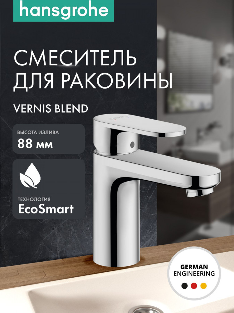 Смеситель для раковины Hansgrohe Vernis Blend — стильное и функциональное решение для современной ванной комнаты. Однорычажное управление обеспечивает удобное и точное регулирование температуры и напора воды, а верхнее расположение рычага делает эксплуатацию максимально комфортной. Излив традиционной формы фиксированного типа имеет высоту 8.8 см и вынос 10.8 см, что обеспечивает удобство при использовании раковины и наполнение сосудов. Механизм работы смесителя — керамический картридж, обеспечивающий долговечность и плавность хода. Модель оснащена функцией экономии расхода воды (5 л/мин). Гибкая подводка и комплект креплений позволяют легко установить смеситель на раковину или столешницу.