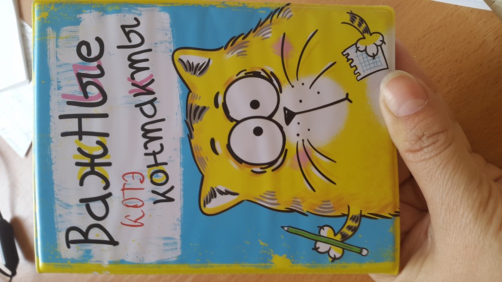 Визитница хорошая - но она реально для визиток) Я сложила пластиковые карты и обложка топорщится. Вообще, все как я люблю: кот и яркие цвета.