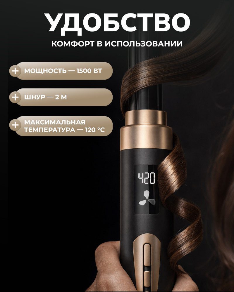 Фен-стайлер оснащён тремя режимами скорости и температуры в диапазоне от 60 до 120 градусов, благодаря чему подходит для тонких, нормальных и плотных волос. ЖК-дисплей отображает текущие параметры работы, упрощая контроль температуры и интенсивности воздушного потока. Встроенная защита от перегрева делает использование прибора безопасным при ежедневной укладке.