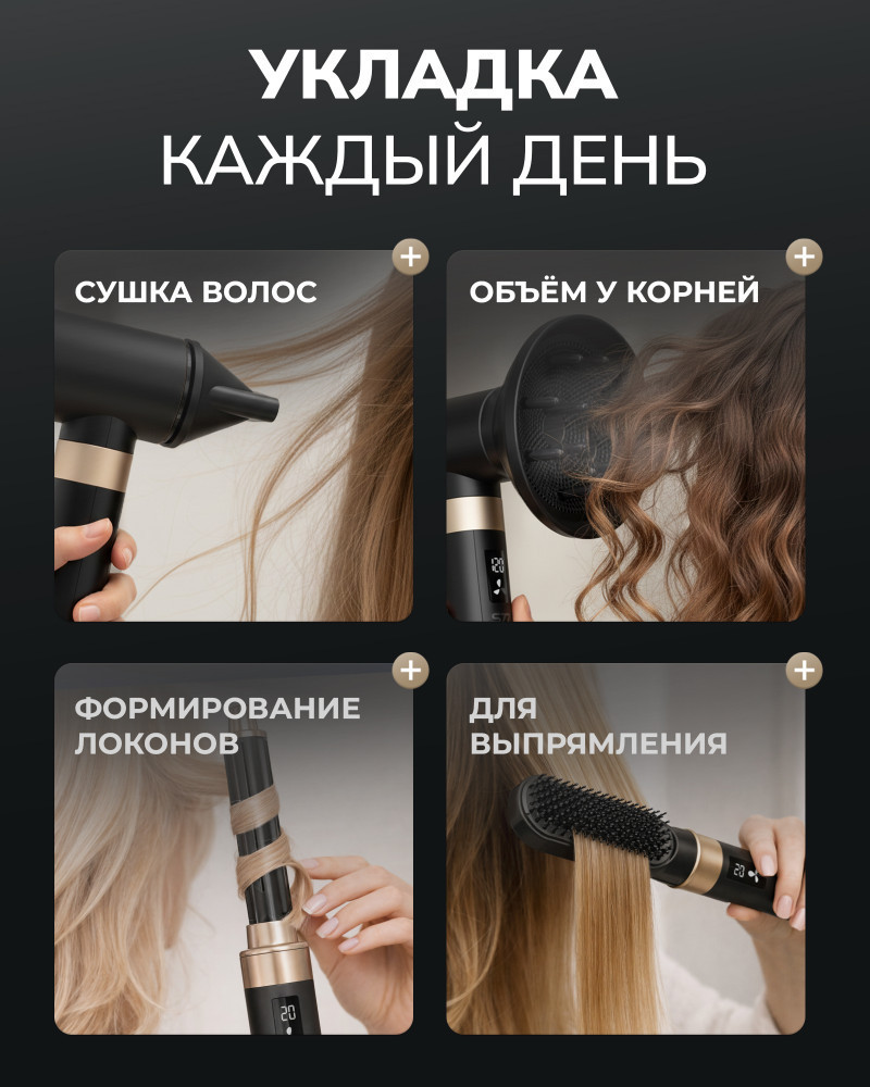 Такой фен с насадками подходит для создания прямых причёсок, мягких волн, упругих кудрей и аккуратной повседневной укладки.