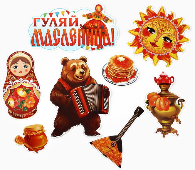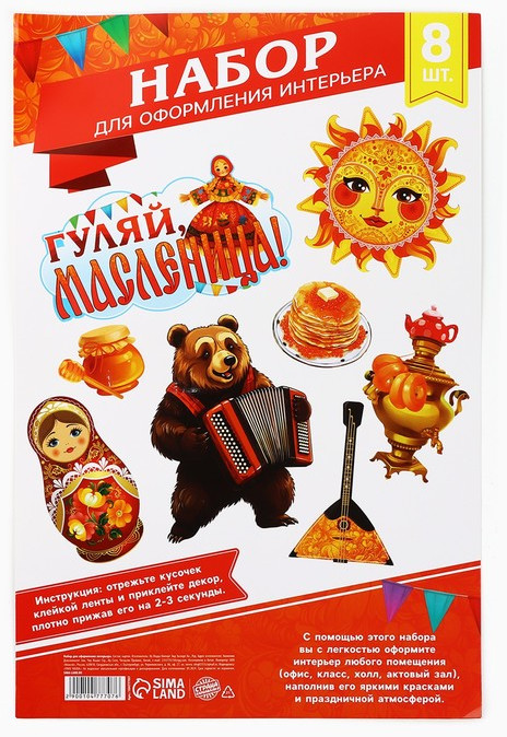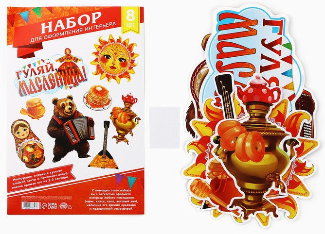 Страна Карнавалия Набор для оформления интерьера «Масленица»В данный момент этот товар отсутствует в продаже. Возможно, у нас найдется аналогичный или похожий товар здесь. Украшения для праздника Масленица — яркий и атмосферный декор, который поможет создать настоящее ощущение народного гулянья и весёлого праздника. Элементы оформления выполнены в традиционном стиле с использованием тёплых, солнечных оттенков и тематических мотивов, символизирующих прощание с зимой и встречу весны. |