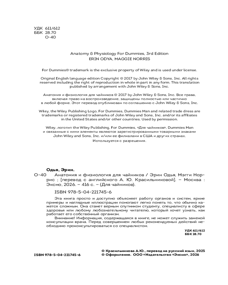 💳 Оплатить за товар можно при получении 🇰🇿 Есть бесплатная доставка по Казахстану от 1 дня 🎁 Копите бонусы с каждой покупки Серия: Для чайников Почему наше тело умеет поддерживать постоянную температуру, даже когда за окном жара или мороз? Что помогает коже восстановиться после пореза или царапины? Что мозг делает с телом во время сна? Авторы — преподаватель анатомии и физиологии Эрин Оудья и научный журналист Мэгги Норрис — объясняют сложные биологические процессы простым языком, дополняя материал наглядными иллюстрациями. Читатель шаг за шагом знакомится с клетками и тканями, органами и системами, узнаёт, как они устроены и взаимодействуют между собой. |