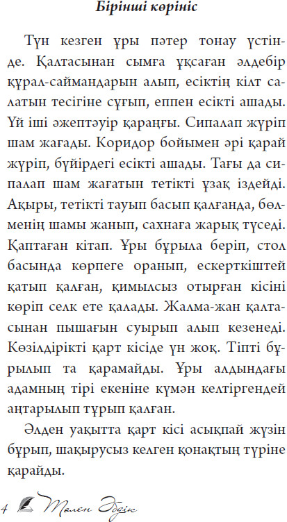 💳 Оплатить за товар можно при получении 🇰🇿 Есть бесплатная доставка по Казахстану от 1 дня 🎁 Копите бонусы с каждой покупки Төлен Әбдіктің «Ардагер» пьесасы – адамгершілік, ар-ождан, рухани жауапкершілік сияқты терең философиялық мәселелерді қозғайтын шығарма. Шығармада басты кейіпкер Ардагердің тағдыры арқылы қоғам мен жеке тұлға арасындағы күрделі қарым-қатынас, адам бойындағы ар мен ұяттың, әділдік пен опасыздықтың тартысы көркем бейнеленеді. Оқиға желісі оқырманды терең ойға жетелейді. |