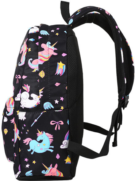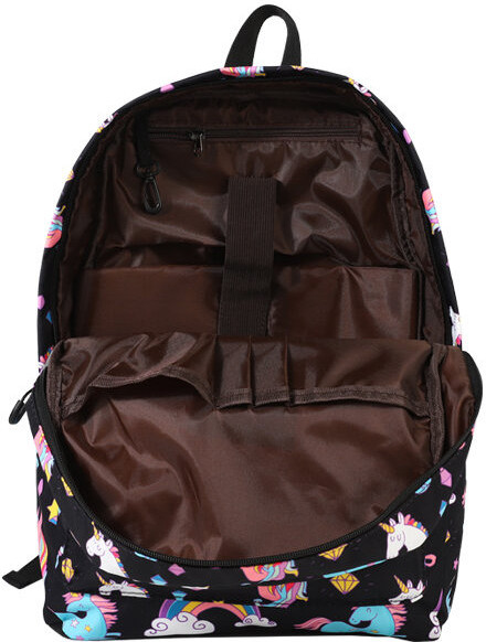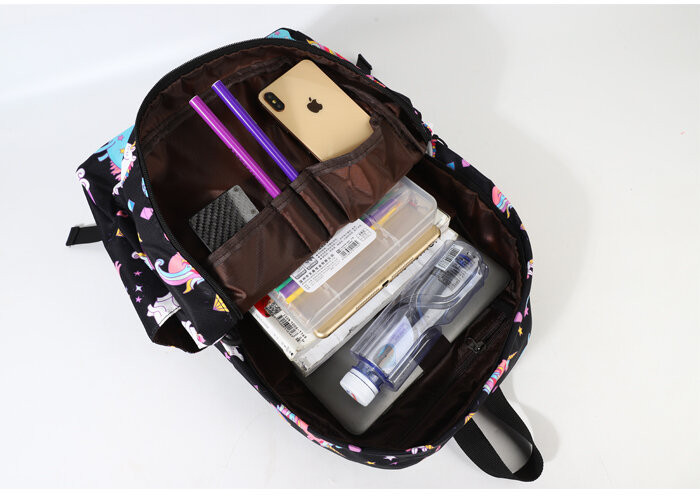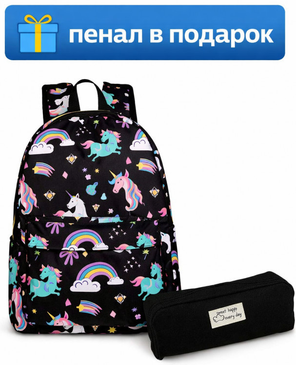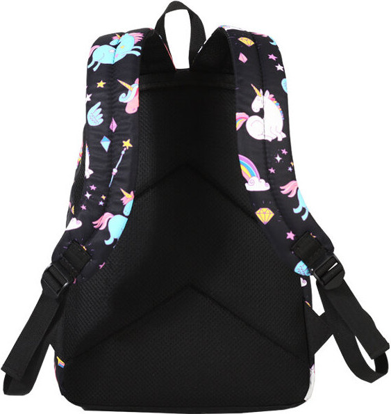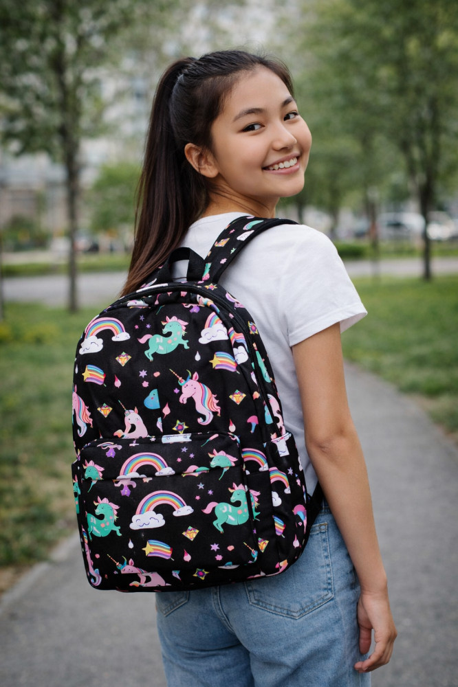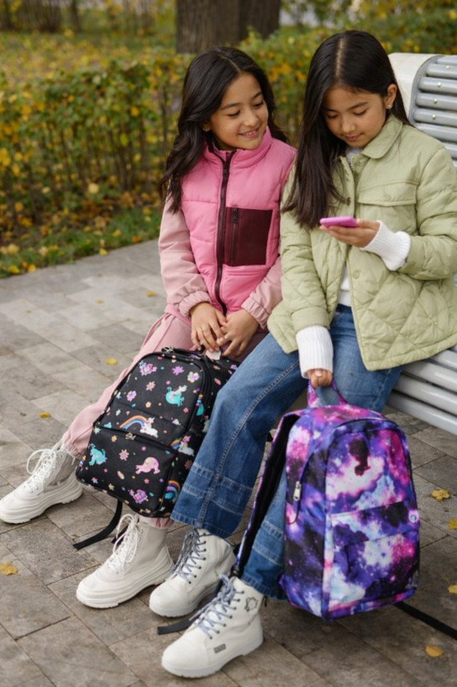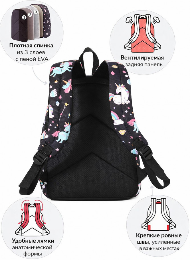 Спинка плотная, достаточно жесткая (с пеной EVA) и «дышащая» благодаря сетчатому внешнему материалу. А регулируемые лямки имеют анатомическую изогнутую форму и удобно сидят на плечах. Материал водоотталкивающий, а рисунок очень яркий, сочный, не выцветает на солнце. Очень прост в уходе: его можно стирать в руками или в машинке при 30 градусах. Он подойдет для ученицы средних классов, а также как рюкзак для девочек подростков постарше. С ним можно ходить и на внешкольные занятия, например в бассейн, на гимнастику, на танцы. Кроме того, его используют и взрослые как городской или повседневный рюкзак.
