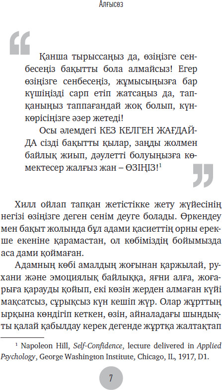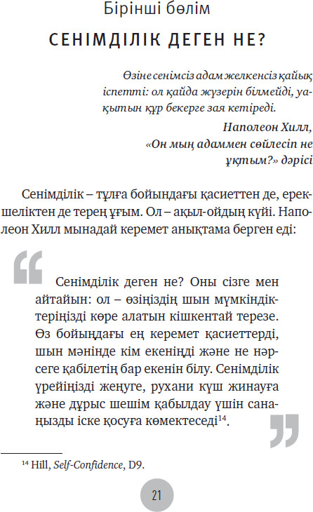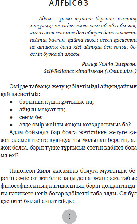 💳 Оплатить за товар можно при получении 🇰🇿 Есть бесплатная доставка по Казахстану от 1 дня 🎁 Копите бонусы с каждой покупки Бұл тәжірибелік нұсқаулық жетістікке жету үшін аса қажет қасиет – өзіңізге деген сенімді нығайту стратегиясымен таныстырады. Автор өзіңізге сенбеудің салдары қандай екенін түсіндіріп, әрбіріміздің өзімізді сынағанды, күмәндана қарағанды қойып, ұмытар мүмкіндігіміз бар дейді. Наполеон Хилл ойлап тапқан формуланы өзіме сенімді бола түссем, өз күшіме сенсем, көбірек мүмкіндік көзін тапсам, ықпал ете алсам және ең үздік қарым-қатынастан ләззат алсам дейтін барша адам кәдесіне жарата алады. |