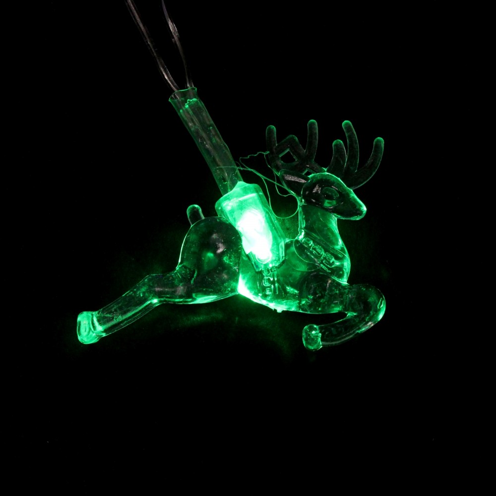 Красивые олени. Часть оленей горит красно-зеленым цветом, другая часть оленей горит красно-синим цветом, а первый олень от вилки горит постоянно сиреневым цветом. Гирлянда очень понравилась, мы ее повесили на маленькую елочку высотой 60 см. Горит, сверкает, радует нас.