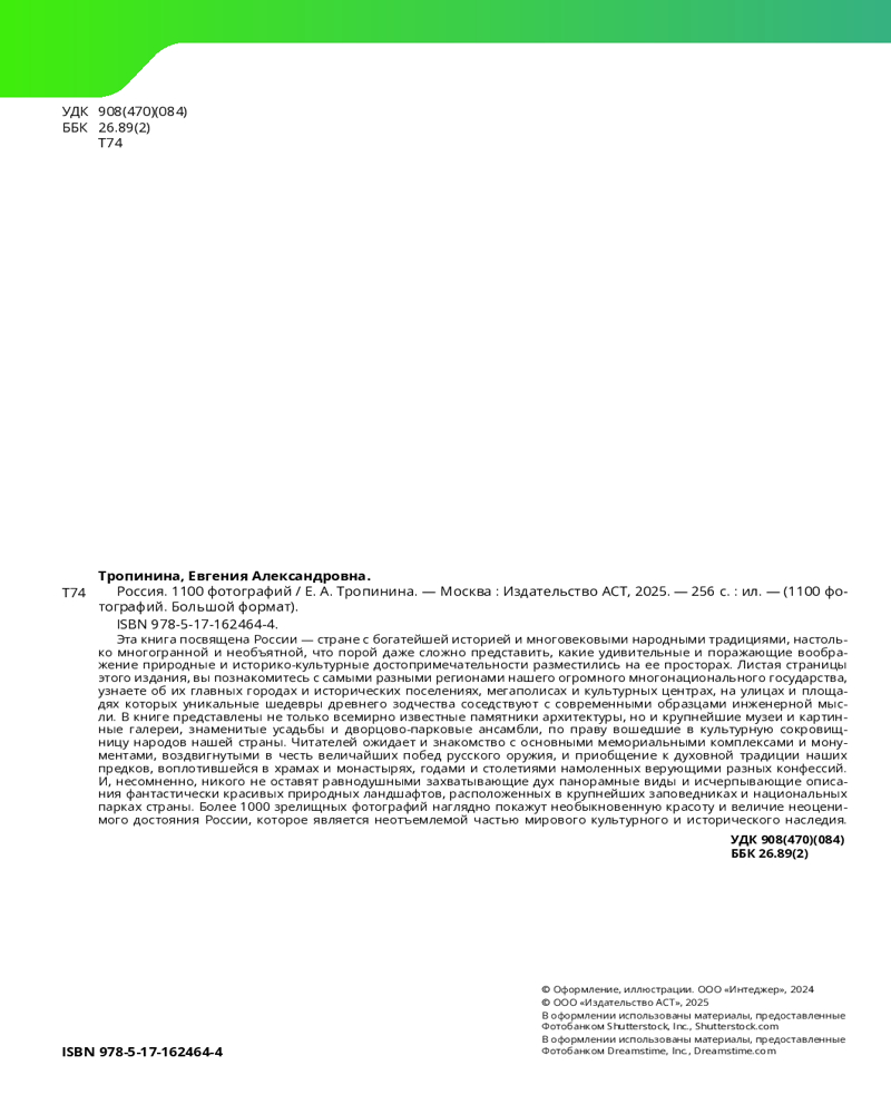 💳 Оплатить за товар можно при получении 🇰🇿 Есть бесплатная доставка по Казахстану от 1 дня 🎁 Копите бонусы с каждой покупки Серия: 1100 фотографий. Большой формат Эта книга посвящена России — стране с богатейшей историей и многовековыми народными традициями, настолько многогранной и необъятной, что порой даже сложно представить, какие удивительные и поражающие воображение природные и историко-культурные достопримечательности разместились на ее просторах. Листая страницы этого издания, вы познакомитесь с самыми разными регионами нашего огромного многонационального государства, узнаете об их главных городах и исторических поселениях, мегаполисах и культурных центрах, на улицах и площадях которых уникальные шедевры древнего зодчества соседствуют с современными образцами инженерной мысли. В книге представлены не только всемирно известные памятники архитектуры, но и крупнейшие музеи и картинные галереи, знаменитые усадьбы и дворцово-парковые ансамбли, по праву вошедшие в культурную сокровищницу народов нашей страны. |