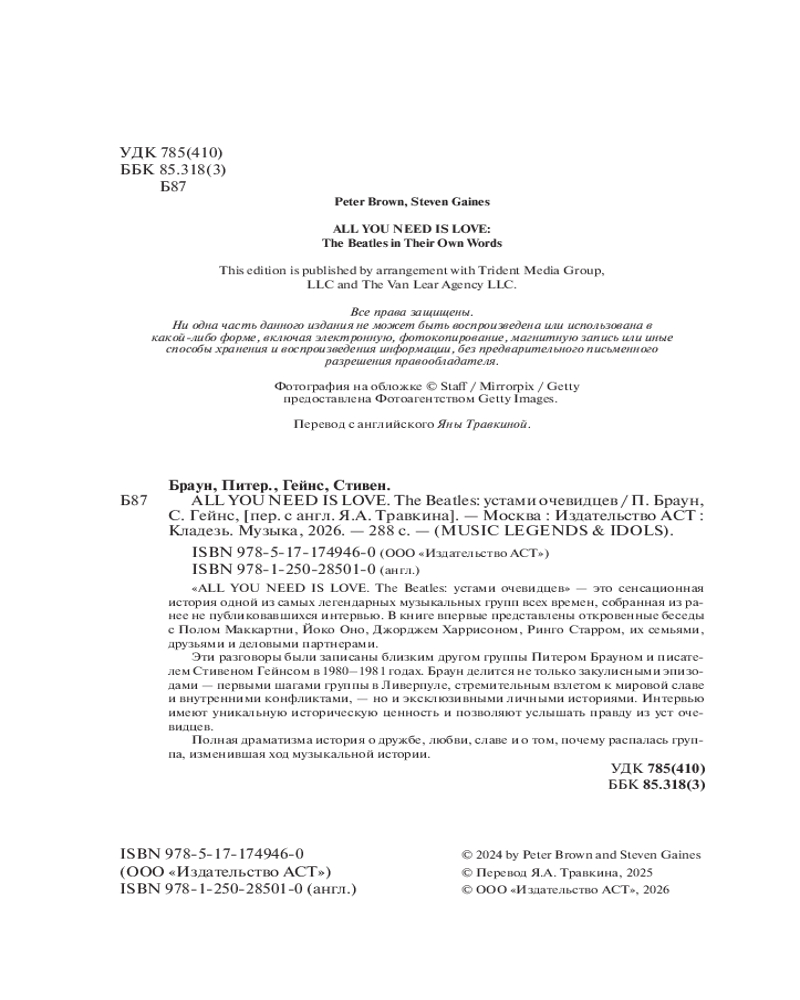 💳 Оплатить за товар можно при получении 🇰🇿 Есть бесплатная доставка по Казахстану от 1 дня 🎁 Копите бонусы с каждой покупки Серия: Music Legends & Idols Сенсационная история одной из самых легендарных музыкальных групп всех времен, собранная из ранее не публиковавшихся интервью. В книге впервые представлены откровенные беседы с Полом Маккартни, Йоко Оно, Джорджем Харрисоном, Ринго Старром, их семьями, друзьями и деловыми партнерами. Эти разговоры были записаны близким другом группы Питером Брауном и писателем Стивеном Гейнсом в 1980–1981 годах. Браун делится не только закулисными эпизодами — первыми шагами группы в Ливерпуле, стремительным взлетом к мировой славе и внутренними конфликтами, — но и эксклюзивными личными историями. Интервью имеют уникальную историческую ценность и позволяют услышать правду из уст очевидцев. Полная драматизма история о дружбе, любви, славе и о том, почему распалась группа, изменившая ход музыкальной истории. |