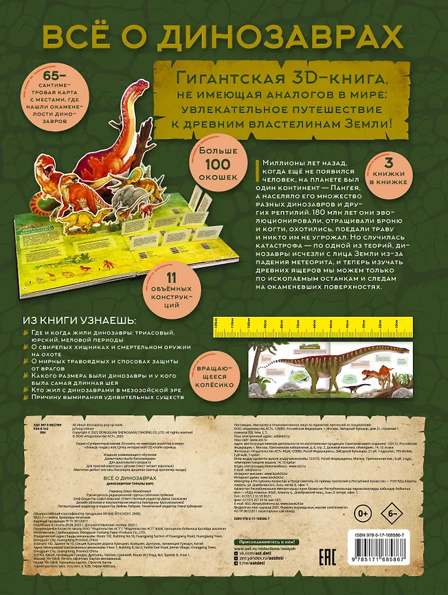💳 Оплатить за товар можно при получении 🇰🇿 Есть бесплатная доставка по Казахстану от 1 дня 🎁 Копите бонусы с каждой покупки Серия: Суперинтерактивная 3D-книга, не имеющая аналогов в мире Миллионы лет назад, когда ещё не появился человек, на планете был один континент — Пангея, а населяло его множество разных динозавров и других рептилий. 180 млн лет они эволюционировали, отращивали броню и когти, охотились, поедали траву, и никто им не угрожал. Но случилась катастрофа — по одной из теорий, динозавры исчезли с лица Земли из-за падения метеорита, и теперь изучать древних ящеров мы можем только по ископаемым останкам и следам на окаменевших поверхностях. |