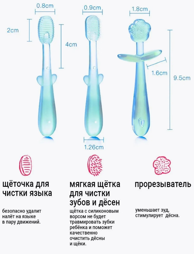 💳 Оплатить за товар можно при получении 🇰🇿 Есть бесплатная доставка по Казахстану от 1 дня 🎁 Копите бонусы с каждой покупки Детские зубные щетки с прорезывателем предназначена для малышей в возрасте от 0+ лет, одного года для ухода за полостью рта. Набор мягких маленьких щёток станет идеальным решением в качестве первой зубной щётки для малыша который только начал знакомиться с гигиеной полости рта. Позвольте малышу играючи справиться с задачей. В набор для гигиены младенца включены: щетка +0 мес, +12 мес, +18 мес для зубов и дёсен, щетка для языка и детский прорезыватель грызунок для уменьшения зуда. Набор для ухода за полостью рта для ребёнка укомплектован в портативный пенал что удобно для мам и малышей собирающихся на прогулку или в путешествие. Монопучковая круглая детская щетка учитывает возрастные особенности ребёнка и может применяться с самого рождения, 1 месяца, до 3 лет. |