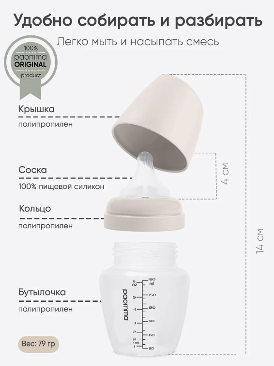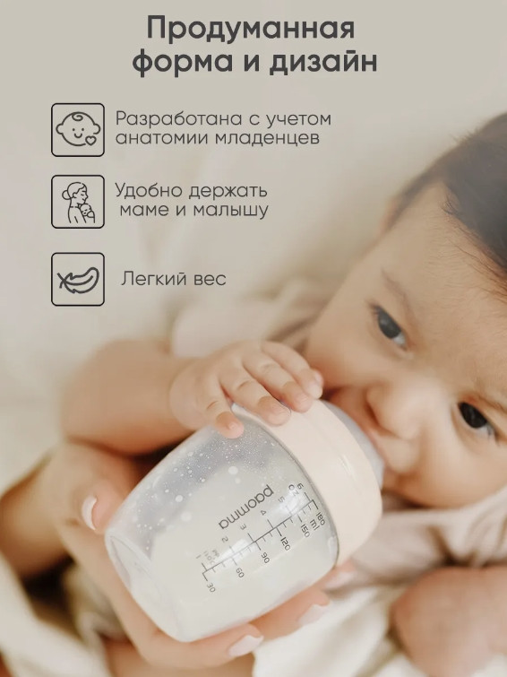 Пластиковая бутылочка для кормления Paomma — идеальный подарок для новорожденного. Она предназначена для малышей с первых дней жизни и оснащена герметичной крышкой и ярко-прорисованной шкалой, начинающейся с 30 мл, с допустимой погрешностью до 5-10 мл. Бутылочка для новорожденных детей имеет широкое горлышко диаметром 5 см, что облегчает её мытье как в посудомоечной машине, так и вручную. Дизайн продуман до мелочей, чтобы малышу и маме было удобно держать её в руках. Высота бутылочки составляет 13,2 см, а ширина — 7,2 см, что позволяет легко помещать её в стерилизатор. Соска изготовлена из 100% пищевого силикона, который является гипоаллергенным и прочным материалом. Антиколиковая система с воздушным клапаном улучшает циркуляцию воздуха, предотвращая боли в животе, икоту и дискомфорт.