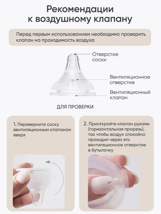 Соска с комбинированной текстурой Mom Effect гладкая и бархатистая, а её форма имитирует материнскую грудь, обеспечивая надежный захват. Внутри бутылочки расположены ребра жесткости, предотвращающие слипание материала при высыхании смеси. Бутылочка также подходит для воды и может использоваться для соков с 3 месяцев. Соски для бутылки доступны отдельно в четырех размерах: S (0-3 месяцев), M (3-6 месяцев), L (1,2 мм, 6-9 месяцев), XL (крестообразная, 9+ месяцев). Рекомендации по уходу включают стерилизацию и кипячение в течение 5 минут. Бутылочка не содержит BPA и фталатов и совместима с большинством моделей стерилизаторов, подогревателей, термосов и термосумок
