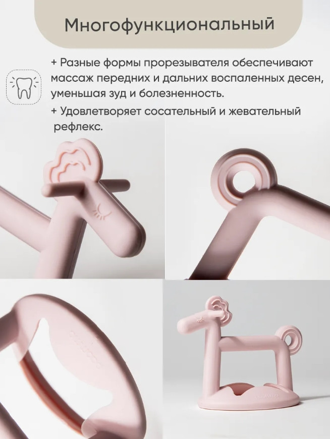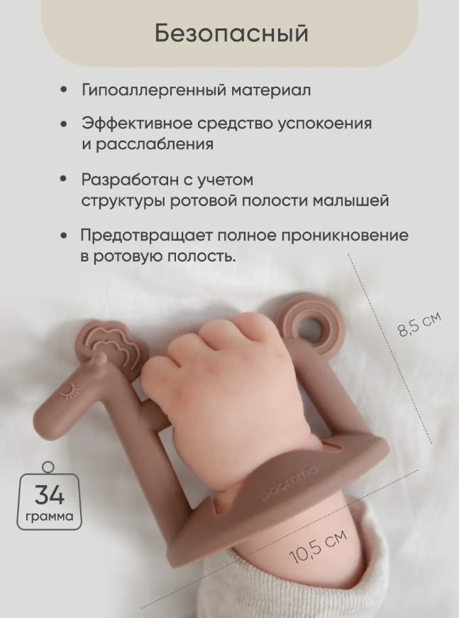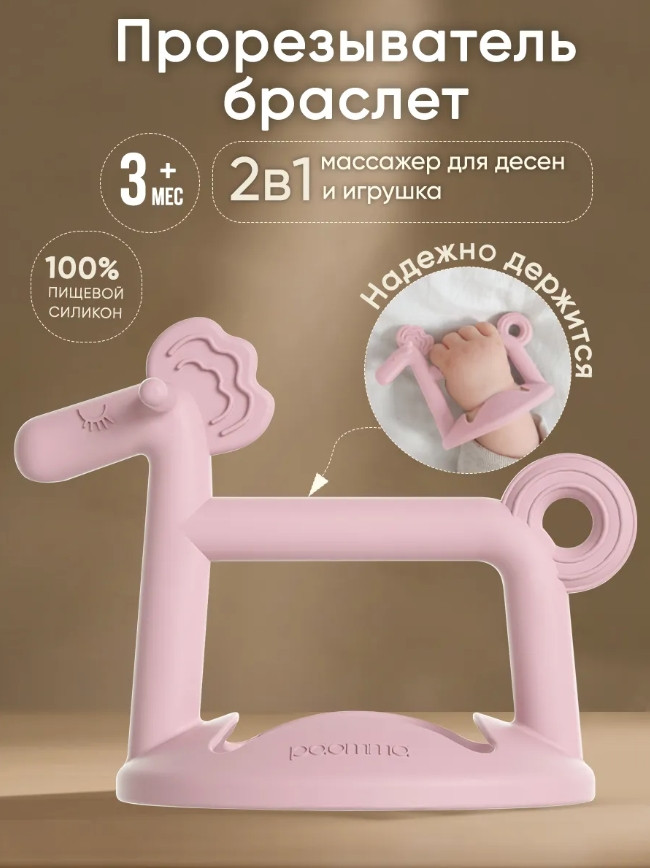 💳 Оплатить за товар можно при получении 🇰🇿 Есть бесплатная доставка по Казахстану от 1 дня 🎁 Копите бонусы с каждой покупки Прорезыватель для зубов Paomma в виде браслета создан с любовью, чтобы поддержать вашего малыша в период появления первых зубов. Мягкий и при этом прочный нетоксичный материал – 100% пищевой силикон – не вызывает аллергии и полностью безопасен для малышей с рождения. Прорезыватель-грызунок разработан с учетом всех физиологических особенностей детей разного возраста, исключает возможность полного проникновения игрушки в рот. Уникальная конструкция позволяет надежно закрепить его на запястье малыша, что значительно упрощает использование. Не нужно беспокоиться о том, что он упадет на пол, что делает развивающую игрушку для новорожденных более гигиеничной и удобной, чем прорезыватель-погремушка, варежка, перчатка. Благодаря форме милого пони, игрушка для малышей привлекает внимание ребенка и развивает воображение, превращая его в первую и самую любимую игрушку до года. Массажные выступы на голове и хвосте грызунка обеспечивают мягкое воздействие на передние и задние дёсны, что способствует снижению зуда, дискомфорта и болезненных ощущений. Такая структура идеально подходит для малышей, у которых начинают резаться зубы, и помогает справиться с неприятными ощущениями. Прорезыватель для зубов охлаждающий необходимо предварительно поместить в холодильник на несколько минут, чтобы получить успокаивающий эффект. Прорезыватель для детей можно ставить вертикально, что предотвращает его контакт с поверхностями и сохраняет его гигиеничность. Силиконовый прорезыватель легко мыть: под проточной водой, в посудомоечной машине, стерилизовать не более 5 минут. Компактная форма также позволяет легко брать его с собой на прогулки или в поездки. Гармоничные пастельные оттенки прорезывателя легко вписываются в интерьер детской комнаты и отлично сочетаются с другими аксессуарами бренда Paomma. |