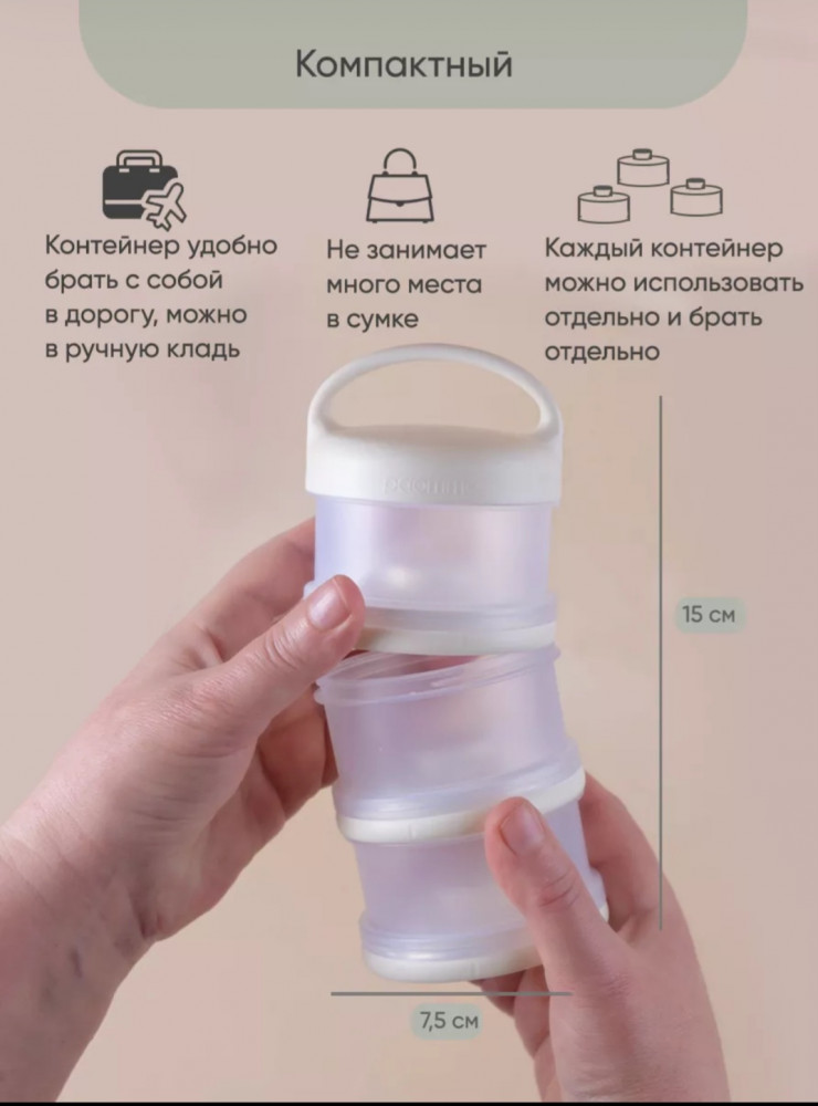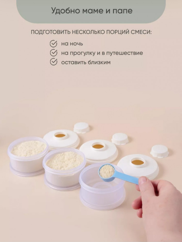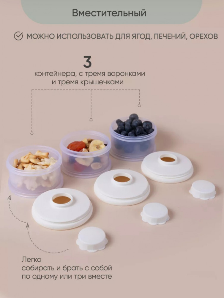 💳 Оплатить за товар можно при получении 🇰🇿 Есть бесплатная доставка по Казахстану от 1 дня 🎁 Копите бонусы с каждой покупки Контейнер для детского питания состоит из 3 отделений. Каждое отделение имеет специальную воронку с крышкой, что позволяет каждое отделение использовать отдельно и легко высыпать смесь в бутылочку. Контейнер удобно брать с собой в дорогу или подготовить несколько порций смеси для кормления на ночь. Широкий носик обеспечивает легкое и полное высыпание смеси из всех трёх отсеков. Крышка надежно закрывается. Каждый отсек контейнера вмещает 3 мерных ложки, 90 г молочной смеси - отличный дозатор для детской смеси на улице, в гостях, ночью. В посуде для детей может храниться не только молочная смесь, но и пюре детское, творог и различные прикормы, детские сладости и снеки. Пищевой контейнер компактный, можно поместить в любую сумку. коляску. Изготовлен из 100% полипропилена, не содержит бисфенола А, ПВХ и фталатов и не взаимодействует с пищевыми продуктами, что делает его безопасным для использования в детском питании. |