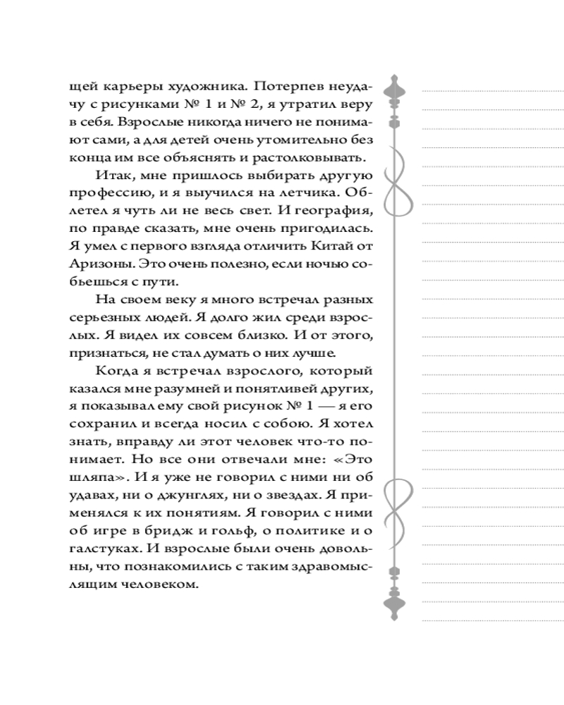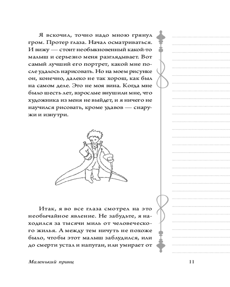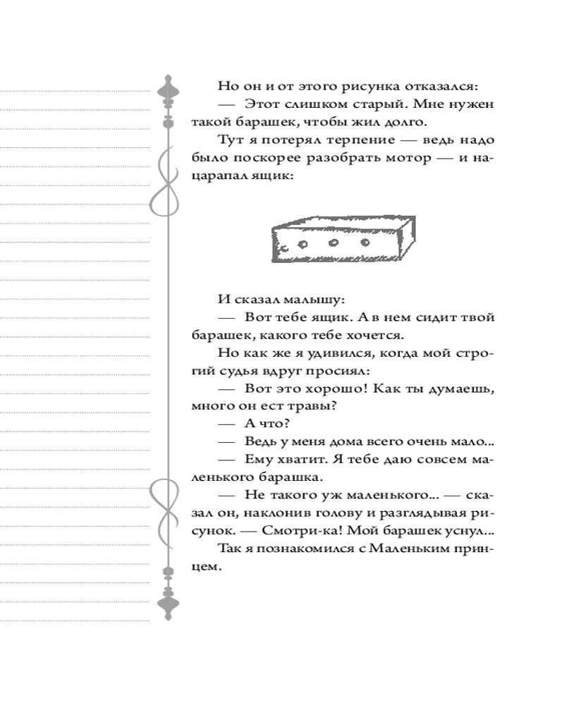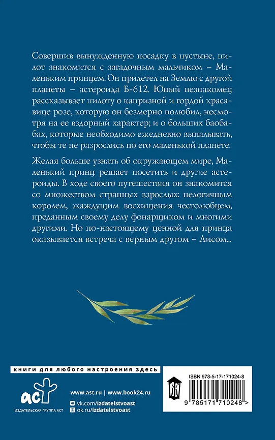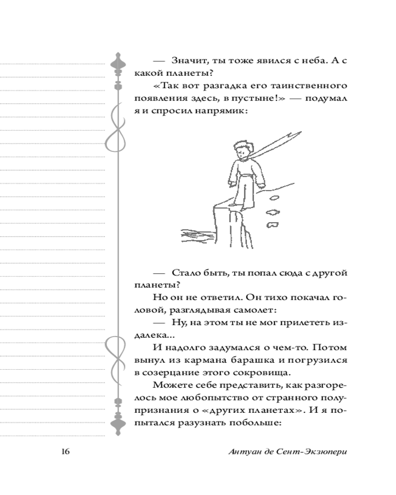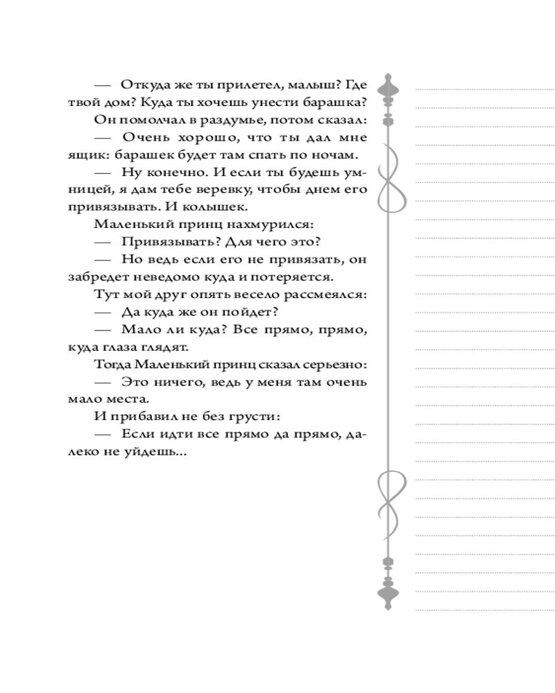 💳 Оплатить за товар можно при получении 🇰🇿 Есть бесплатная доставка по Казахстану от 1 дня 🎁 Копите бонусы с каждой покупки Серия: Классика для себя Совершив вынужденную посадку в пустыне, пилот знакомится с загадочным мальчиком – Маленьким принцем. Он прилетел на Землю с другой планеты – астероида Б-612. Юный незнакомец рассказывает пилоту о капризной и гордой красавице розе, которую он безмерно полюбил, несмотря на ее вздорный характер; и о больших баобабах, которые необходимо ежедневно выпалывать, чтобы те не разрослись по его маленькой планете. |