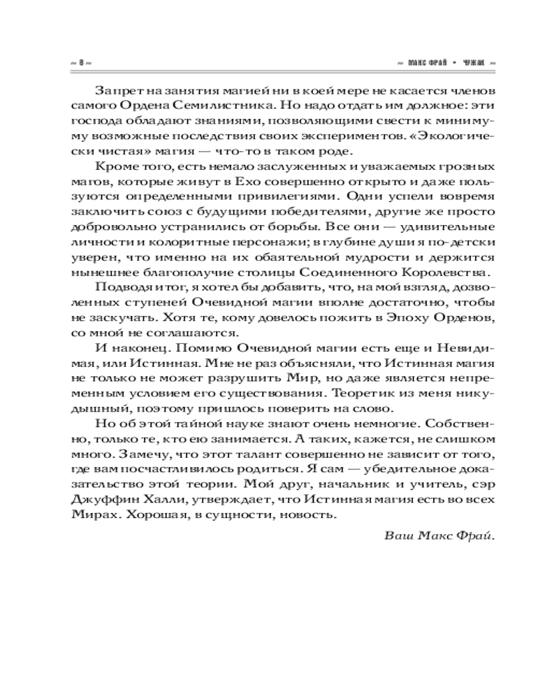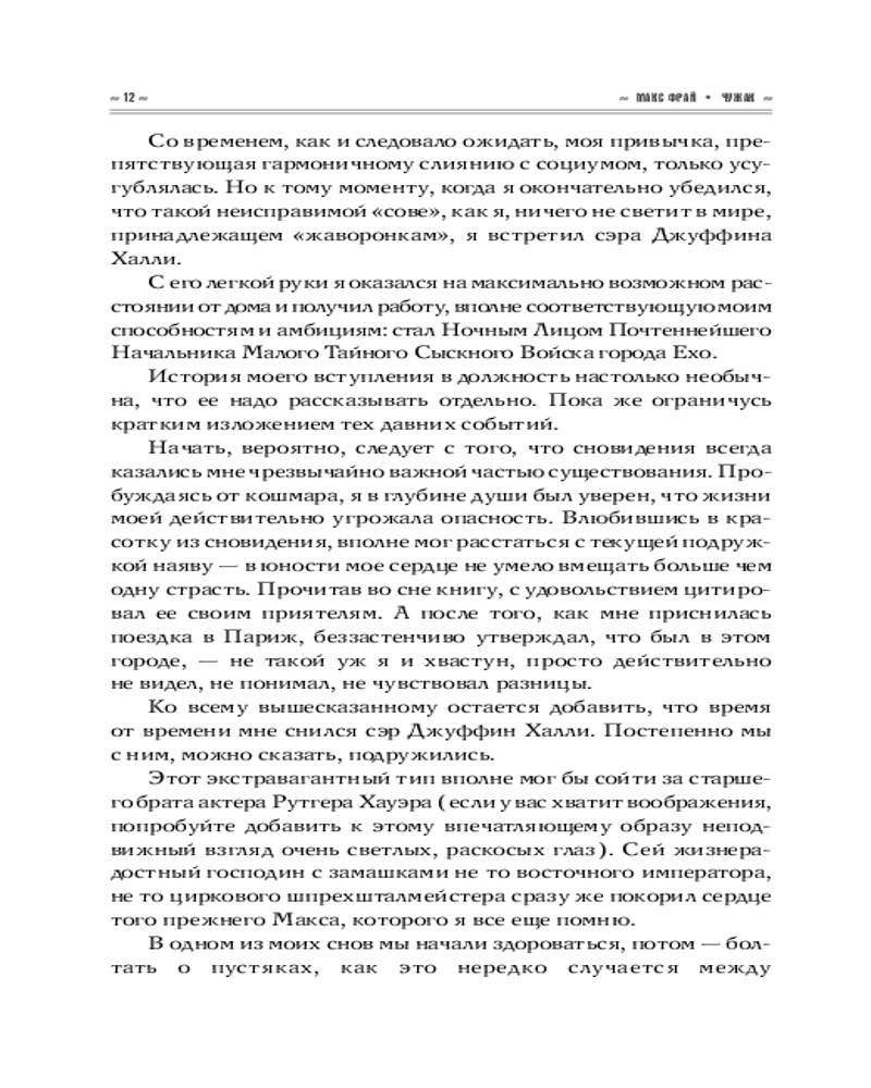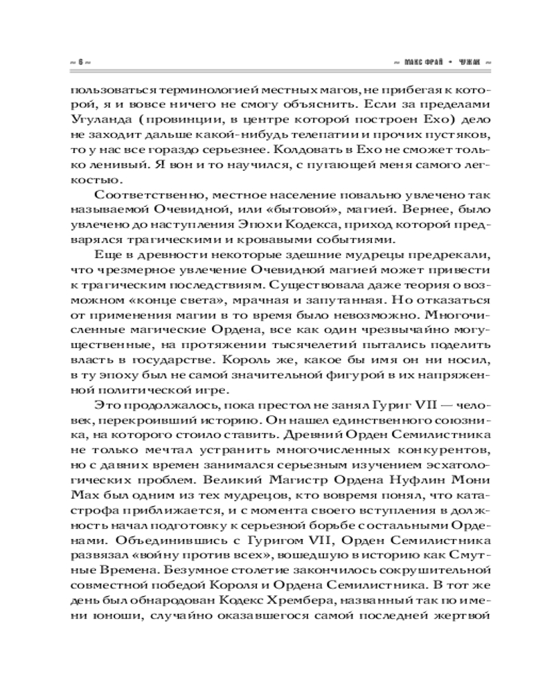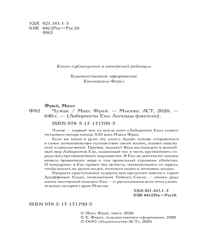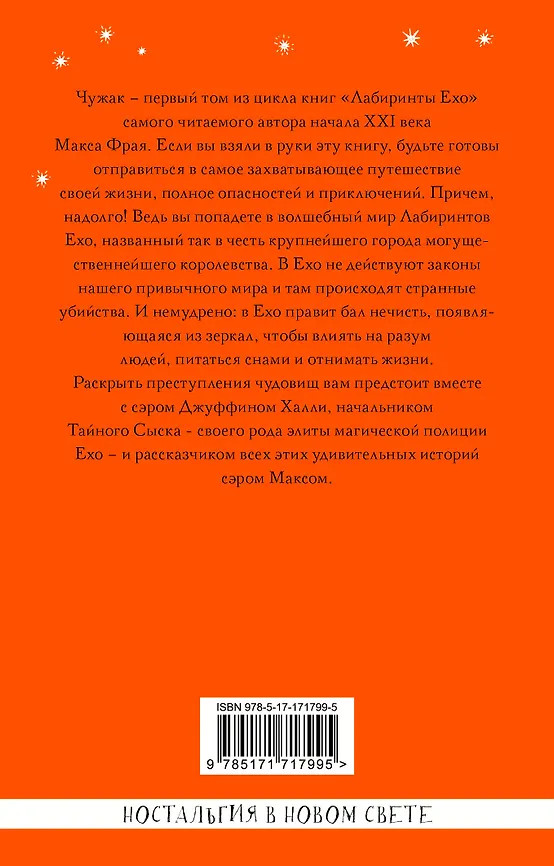 💳 Оплатить за товар можно при получении 🇰🇿 Есть бесплатная доставка по Казахстану от 1 дня 🎁 Копите бонусы с каждой покупки Серия: Лабиринты Ехо. Легенда фэнтези «Чужак» — первый том из цикла книг «Лабиринты Ехо» самого читаемого автора начала ХХI века Макса Фрая. Если вы взяли в руки эту книгу, будьте готовы отправиться в самое захватывающее путешествие своей жизни, полное опасностей и приключений. Причем надолго! Ведь вы попадете в волшебный мир Лабиринтов Ехо, названный так в честь крупнейшего города могущественнейшего королевства. В Ехо не действуют законы нашего привычного мира, и там происходят странные убийства. И немудрено: в Ехо правит бал нечисть, появляющаяся из зеркал, чтобы влиять на разум людей, питаться снами и отнимать жизни. Раскрыть преступления чудовищ вам предстоит вместе с сэром Джуффином Халли, начальником Тайного Сыска — своего рода элиты магической полиции Ехо — и рассказчиком всех этих удивительных историй сэром Максом. |