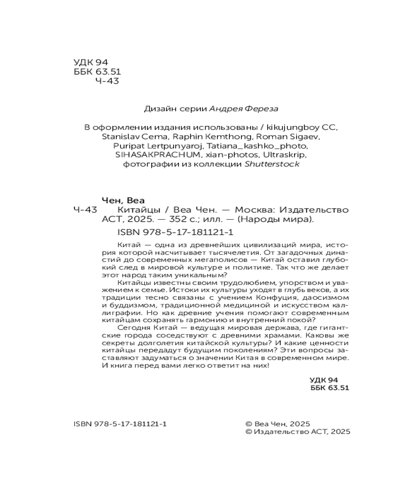 💳 Оплатить за товар можно при получении 🇰🇿 Есть бесплатная доставка по Казахстану от 1 дня 🎁 Копите бонусы с каждой покупки Серия: Народы мира Китай — одна из древнейших цивилизаций мира, история которой насчитывает тысячелетия. От загадочных династий до современных мегаполисов — Китай оставил глубокий след в мировой культуре и политике. Так что же делает этот народ таким уникальным? Китайцы известны своим трудолюбием, упорством и уважением к семье. Истоки их культуры уходят в глубь веков, а их традиции тесно связаны с учением Конфуция, даосизмом и буддизмом, традиционной медициной и искусством каллиграфии. Но как древние учения помогают современным китайцам сохранять гармонию и внутренний покой? |