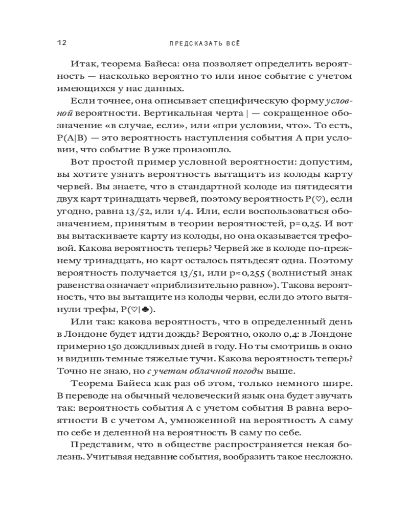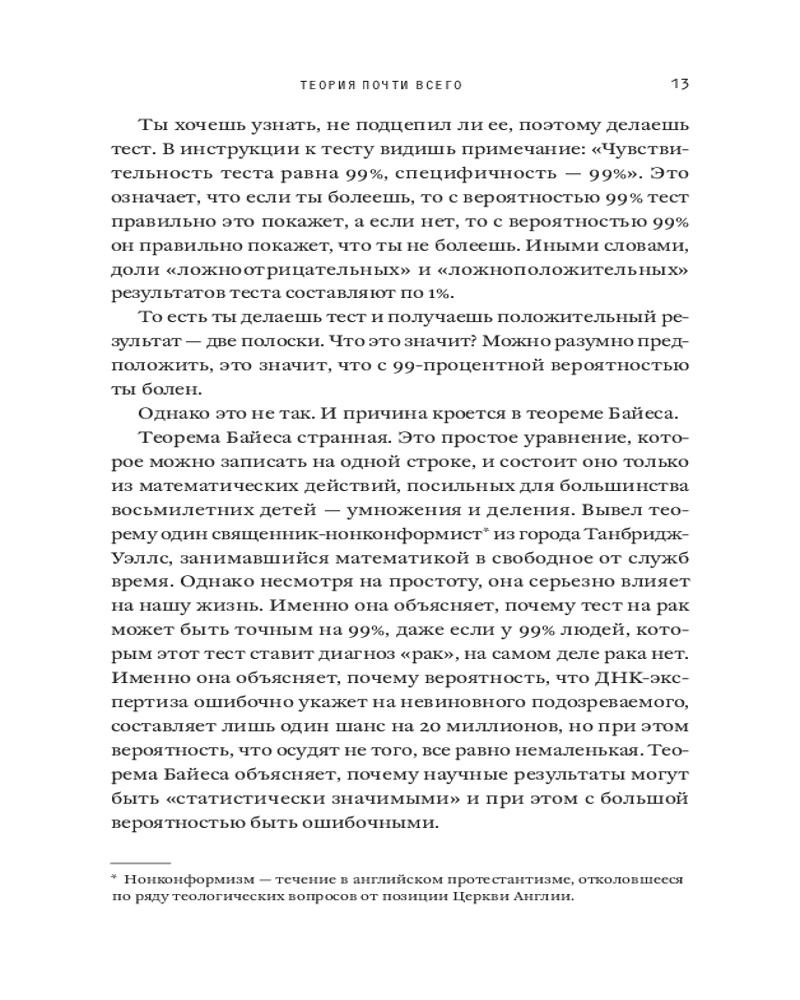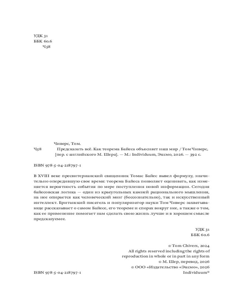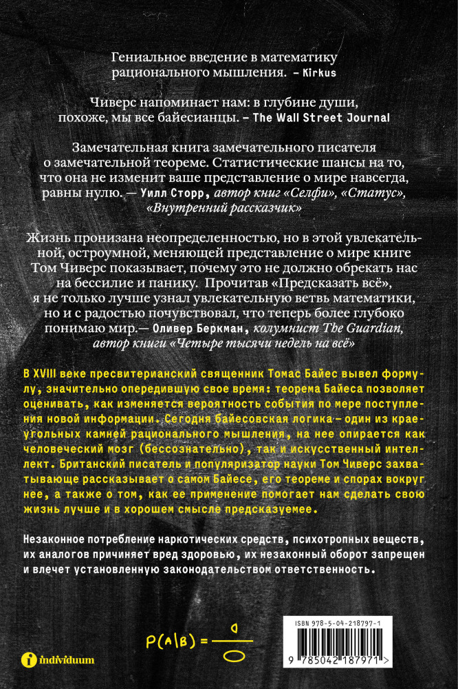 💳 Оплатить за товар можно при получении 🇰🇿 Есть бесплатная доставка по Казахстану от 1 дня 🎁 Копите бонусы с каждой покупки Серия: Individuum В XVIII веке пресвитерианский священник Томас Байес вывел формулу, значительно опередившую свое время: теорема Байеса позволяет оценивать, как изменяется вероятность события по мере поступления новой информации. Сегодня байесовская логика — один из краеугольных камней рационального мышления, на нее опирается как человеческий мозг (бессознательно), так и искусственный интеллект. Британский писатель и популяризатор науки Том Чиверс захватывающе рассказывает о самом Байесе, его теореме и спорах вокруг нее, а также о том, как ее применение помогает нам сделать свою жизнь лучше и в хорошем смысле предсказуемее. |