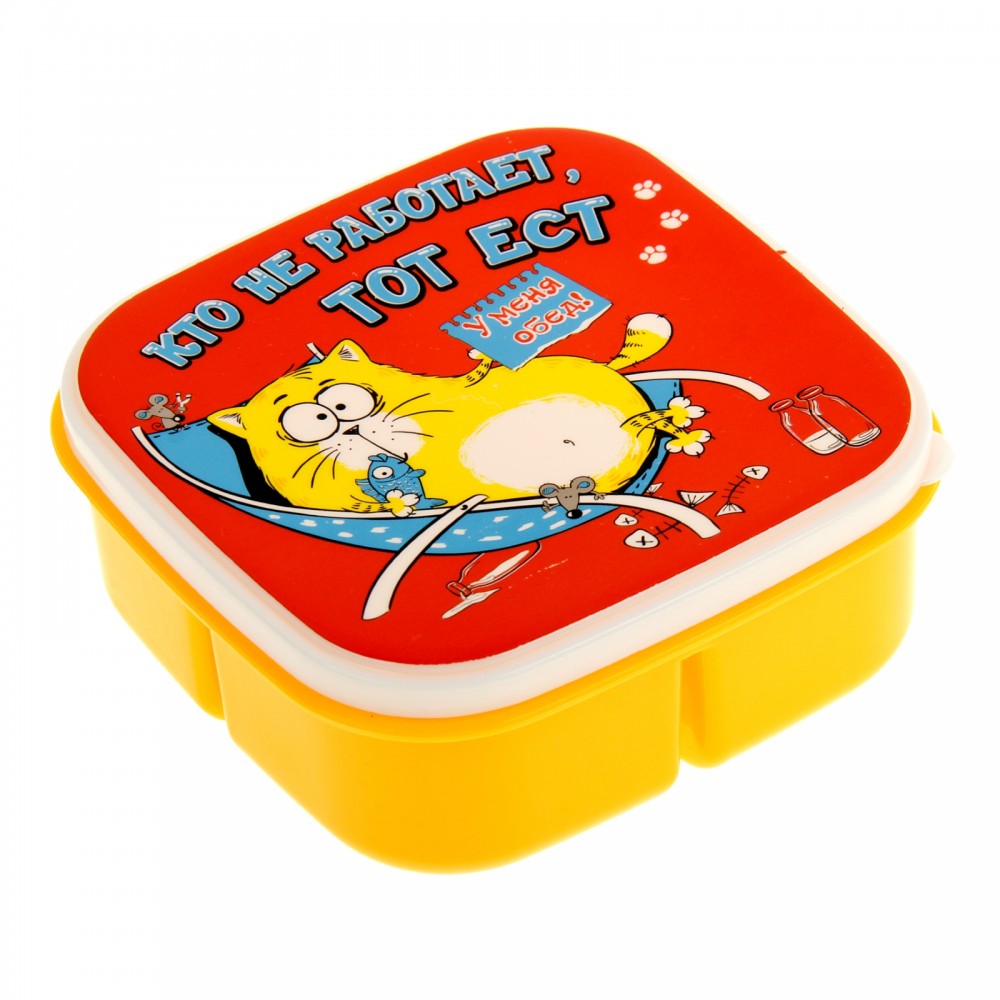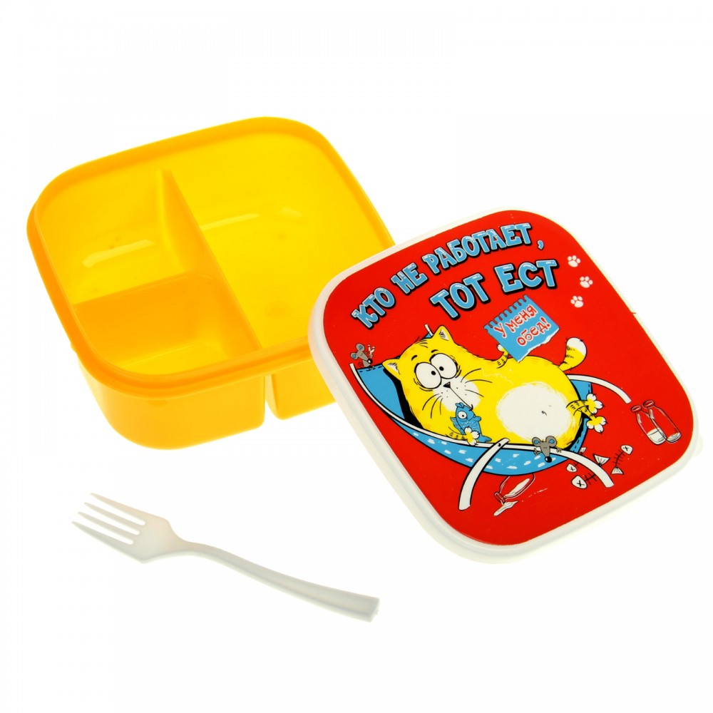 В данный момент этот товар отсутствует в продаже. Возможно, у нас найдется аналогичный или похожий товар здесь. Пора сделать перерыв на обед! Солнечный и позитивный ланч-бокс «Кто не работает, тот ест» станет вашим замечательным помощником во время трапезы вне дома. Практичный и удобный, он разделён на три отделения, которые позволяют взять с собой полноценный обед: салат, второе блюдо и гарнир. Благодаря надёжным креплениям крышки ваша еда никуда «не убежит», и вы сможете насладиться ей в любое время. Чтобы вы не беспокоились о столовых приборах, мы добавили маленькую вилку.