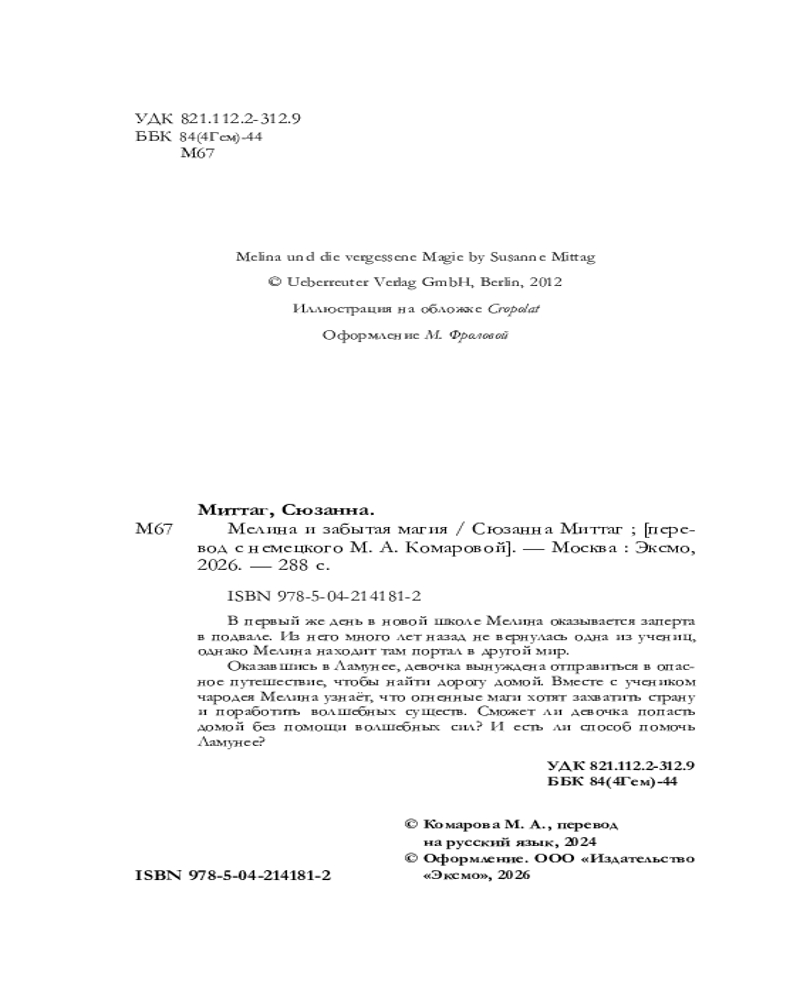💳 Оплатить за товар можно при получении 🇰🇿 Есть бесплатная доставка по Казахстану от 1 дня 🎁 Копите бонусы с каждой покупки Серия: Путь магии. Фэнтези для подростков В первый же день в новой школе Мелина оказывается заперта в подвале. Из него много лет назад не вернулась одна из учениц, однако Мелина находит там портал в другой мир. Оказавшись в Ламунее, девочка вынуждена отправиться в опасное путешествие, чтобы найти дорогу домой. Вместе с учеником чародея Мелина узнаёт, что огненные маги хотят захватить страну и поработить волшебных существ. Сможет ли девочка попасть домой без помощи волшебных сил? И есть ли способ помочь Ламунее? |