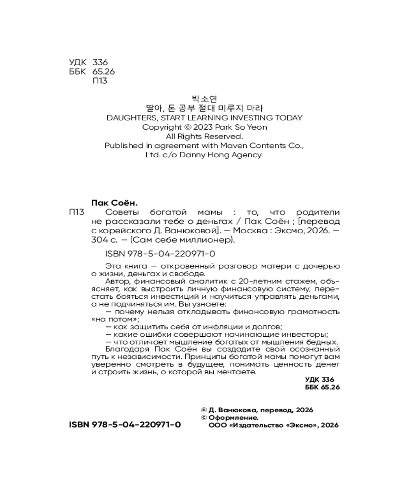 💳 Оплатить за товар можно при получении 🇰🇿 Есть бесплатная доставка по Казахстану от 1 дня 🎁 Копите бонусы с каждой покупки Серия: Сам себе миллионер Эта книга — откровенный разговор матери с дочерью о жизни, деньгах и свободе. Автор, финансовый аналитик с 20-летним стажем, объясняет, как выстроить личную финансовую систему, перестать бояться инвестиций и научиться управлять деньгами, а не подчиняться им. |