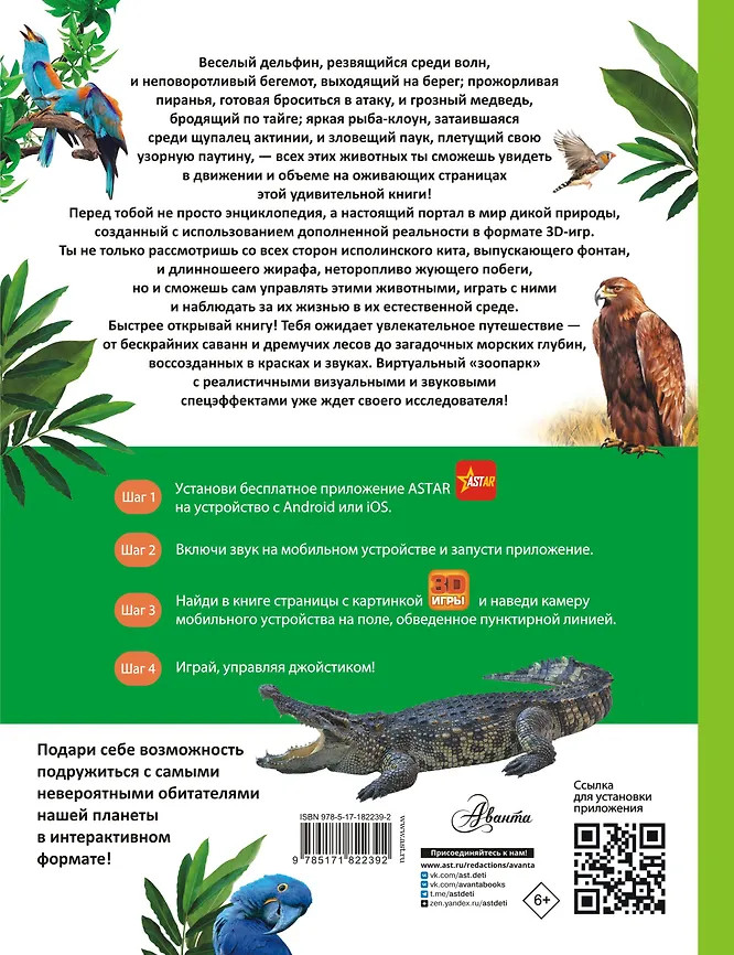 💳 Оплатить за товар можно при получении 🇰🇿 Есть бесплатная доставка по Казахстану от 1 дня 🎁 Копите бонусы с каждой покупки Серия: Простая наука 4D Перед вами уникальная интерактивная энциклопедия, которая перенесет вас в удивительный мир дикой природы с помощью технологий дополненной реальности. Перелистывая ее страницы, вы сможете совершить путешествие по разным континентам и океанам: познакомитесь с грозным львом, изящным жирафом, благородным оленем, могучими слоном и носорогом, забавными пандами и другими представителями богатой земной фауны. Не менее увлекательно и погружение в подводное царство, где обитают зубастые акулы и пираньи, игривые дельфины, ядовитые рыбы-шары и причудливые рыбы-удильщики. Вы также откроете для себя мир рептилий и насекомых, узнаете секреты черепах, крокодилов, ящериц и пауков, а еще познакомитесь с царством пернатых — от нелетающего страуса до величественных орлов и грифов. Главная особенность книги — возможность оживить ее страницы с помощью бесплатного приложения ASTAR: просто наведите камеру смартфона или планшета на специальные метки, и вы увидите животных в движении и объеме, сможете управлять виртуальными моделями и рассмотреть со всех сторон умных обезьянок, ядовитых скорпионов и гигантских китов. Это издание предназначено для любознательных детей, которые хотят не просто прочесть информацию о животных, но и увидеть их «вживую». Погрузитесь в мир природы, используя возможности 3D-технологий! |