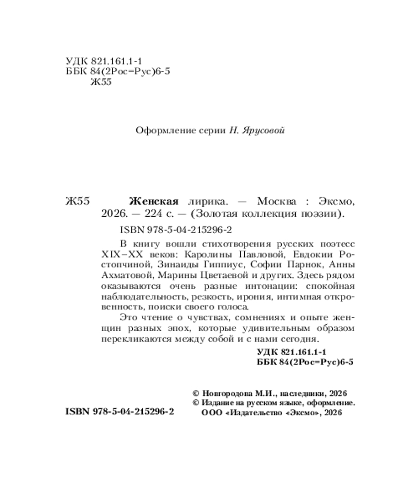 💳 Оплатить за товар можно при получении 🇰🇿 Есть бесплатная доставка по Казахстану от 1 дня 🎁 Копите бонусы с каждой покупки Серия: Золотая коллекция поэзии В книгу вошли стихотворения русских поэтесс XIX-XX веков: Каролины Павловой, Евдокии Ростопчиной, Зинаиды Гиппиус, Софии Парнок, Анны Ахматовой, Марины Цветаевой и других. Здесь рядом оказываются очень разные интонации: спокойная наблюдательность, резкость, ирония, интимная откровенность, поиски своего голоса. Это чтение о чувствах, сомнениях и опыте женщин разных эпох, которые удивительным образом перекликаются между собой и с нами сегодня. |
