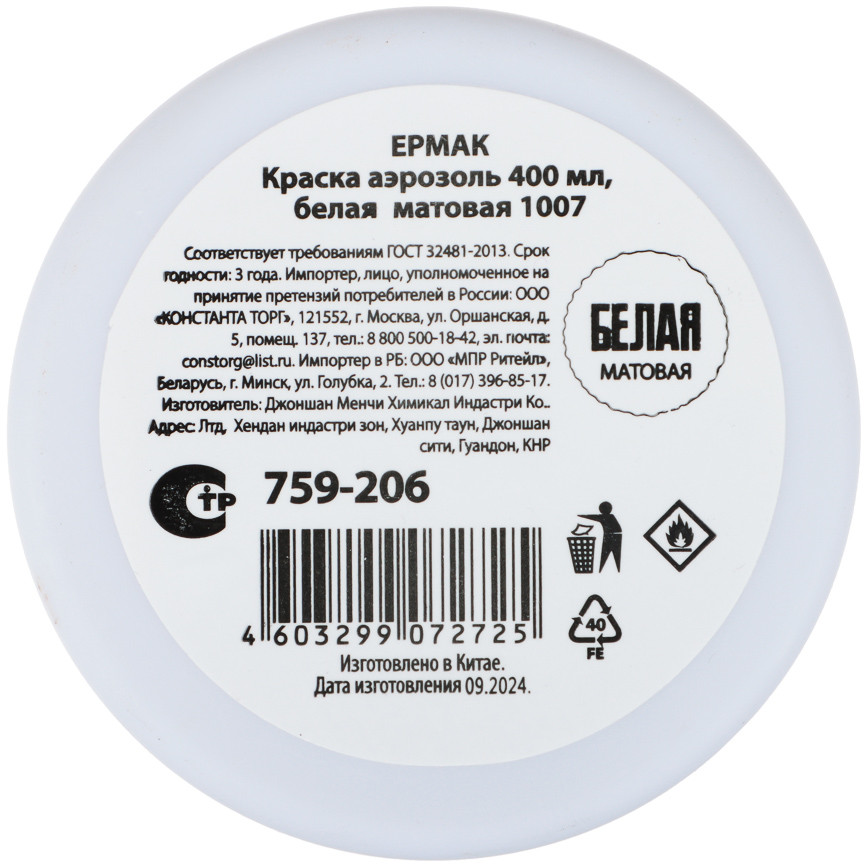 ЕРМАК Краска аэрозольная, 1007 белая матовая
