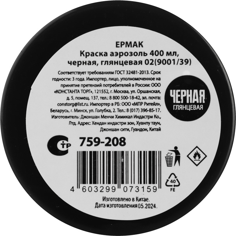 ЕРМАК Краска аэрозольная, 02 9001/39 черная глянцевая