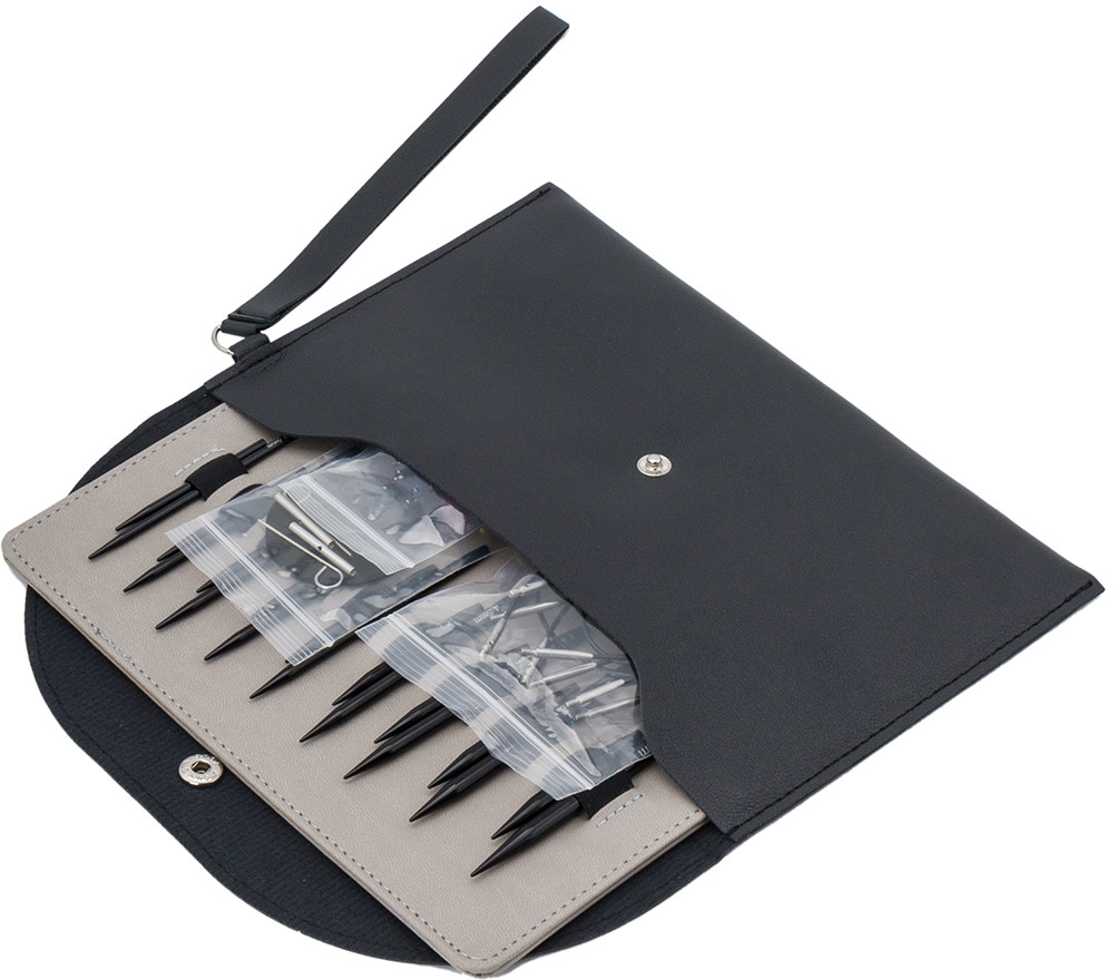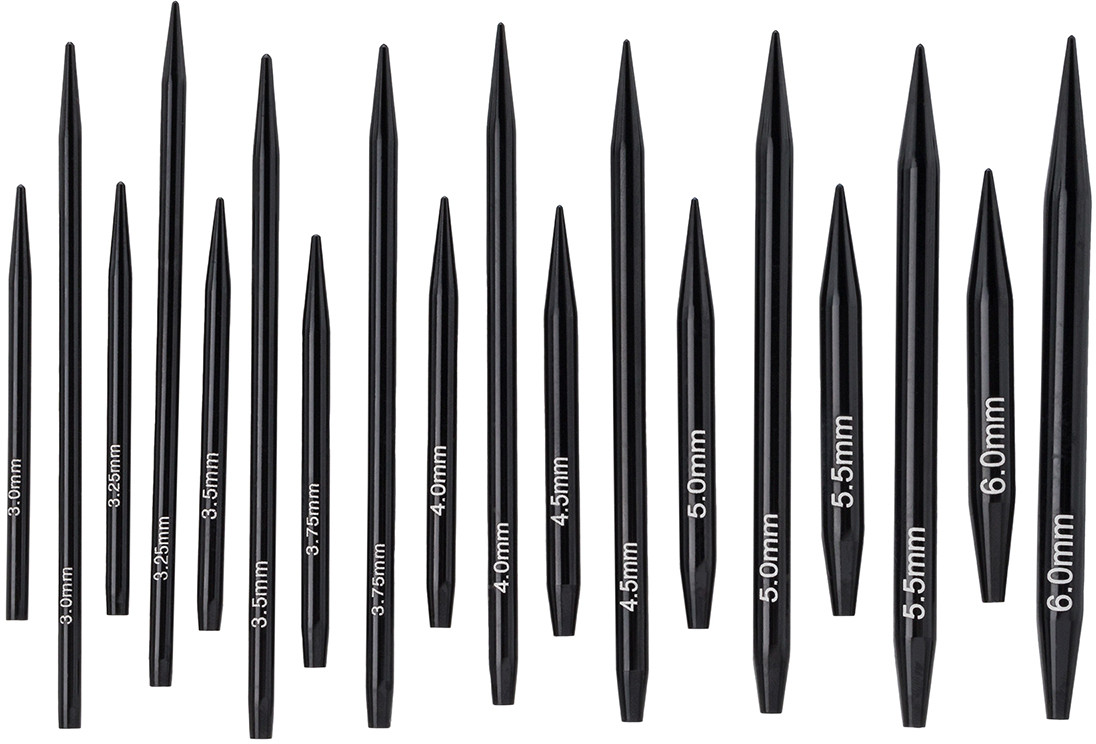 На каждую спицу нанесена маркировка с указанием размера: 3 мм, 3,25 мм, 3,5 мм, 3,75 мм, 4 мм, 4,5 мм, 5 мм, 5,5 мм, 6 мм. Качество соединения безупречно — тросик надежно фиксируется на спице, обеспечивая надежное и прочное крепление. Также в наборе вы найдете сменные тросики, заглушки и ключики для тросиков, коннекторы, патч для удержания спицы. Все вязальные принадлежности компактно упакованы в чехол на кнопке, который легко брать с собой в дорогу или на мастер-классы.