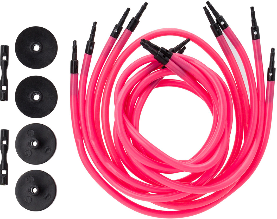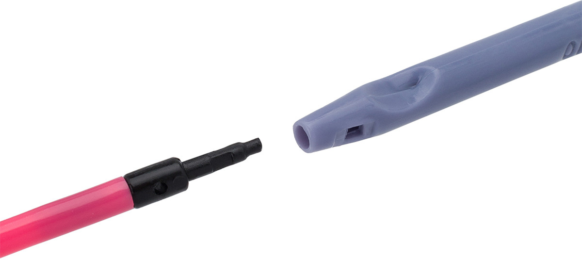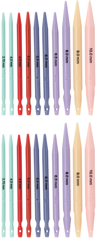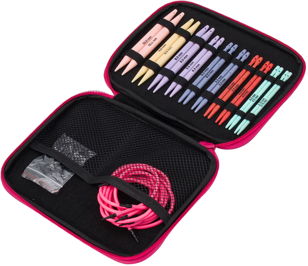 На каждую спицу нанесена маркировка с указанием размера: 3,75 мм, 4 мм, 4,5 мм, 5 мм, 5,5 мм, 6 мм, 6,5 мм, 8 мм, 9 мм и 10 мм. Для удобства все размеры имеют индивидуальный цвет. Качество соединения безупречно — тросик надежно фиксируется на спице, обеспечивая надежное и прочное крепление. Также в наборе вы найдете сменные тросики, заглушки и коннекторы. Все вязальные принадлежности компактно упакованы в чехол на молнии, который легко брать с собой в дорогу или на мастер-классы.