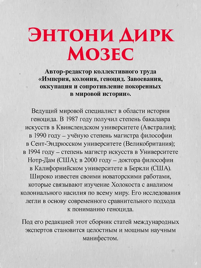 💳 Оплатить за товар можно при получении 🇰🇿 Есть бесплатная доставка по Казахстану от 1 дня 🎁 Копите бонусы с каждой покупки Серия: Современная история массового насилия В 1944 году Рафаэль Лемкин (польский юрист, автор проекта Конвенции ООН о предупреждении и наказании преступления геноцида) ввел термин «геноцид» для описания иностранной оккупации, которая уничтожила или навсегда искалечила подвластное население. Согласно этой традиции, книга «Империя, колония, геноцид» включает геноцид как явление в эпохальные геополитические преобразования последних 500 лет: европейскую колонизацию земного шара, взлет и падение континентальных сухопутных империй, насильственную деколонизацию и формирование национальных государств. Такой взгляд на вещи бросает вызов привычному пониманию массовых преступлений двадцатого века и показывает, что геноцид и «этнические чистки» были неотъемлемой частью имперской экспансии. |